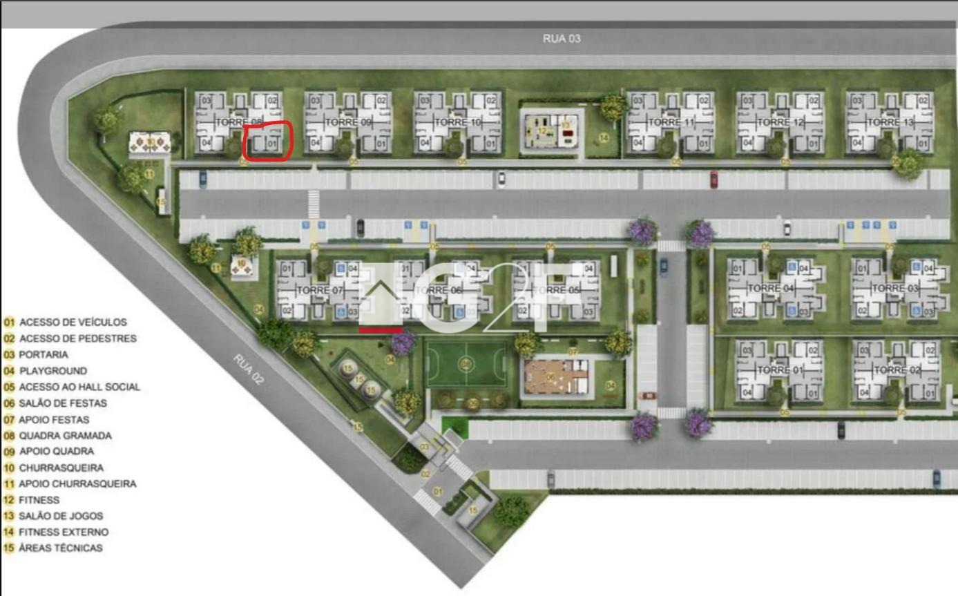 A área de lazer conta com churrasqueira, salão de jogos, salão de festas, fitness, playground, fitness externo, quadra gramada