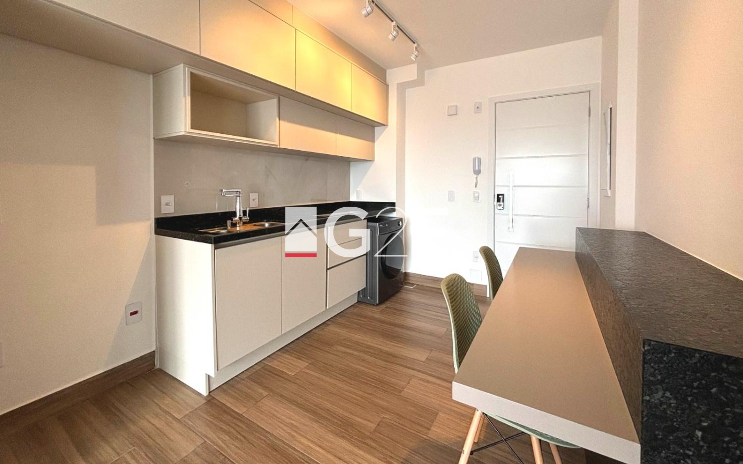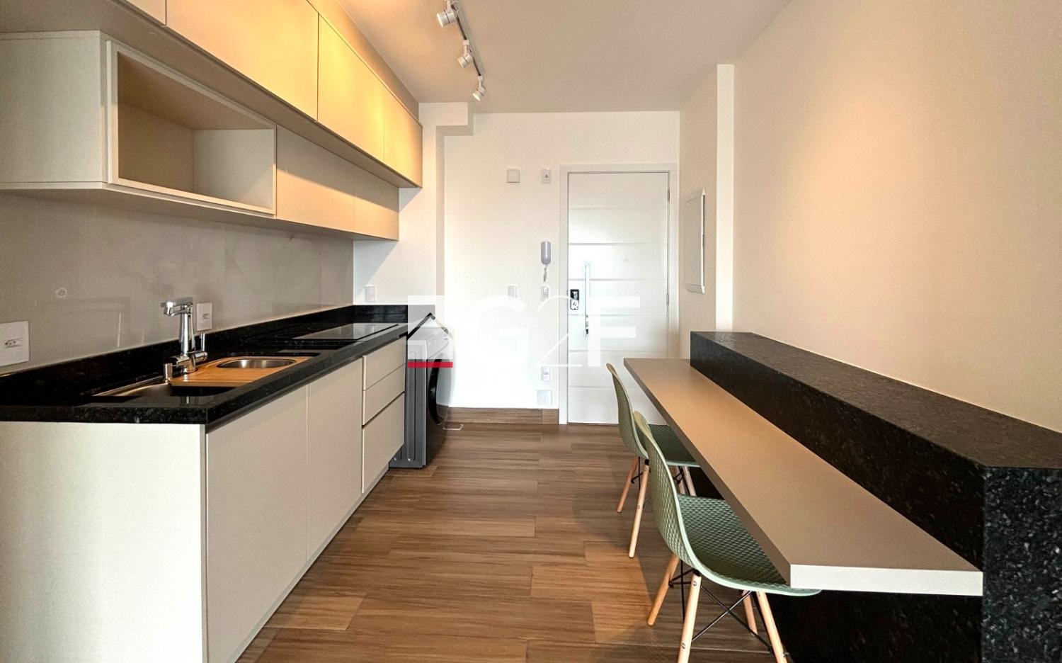 Apartamento no Mandarim Patriani Guanabara com 40m², acesso por fechadura biométrica e cozinha planejada com bancada para refeições.