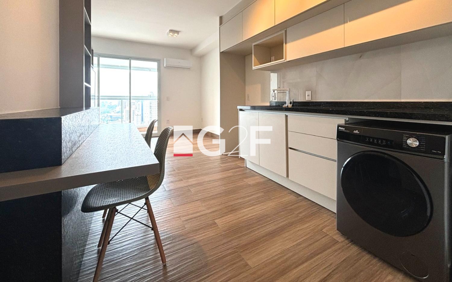 O apartamento será entregue totalmente equipado com TV, 2 máquinas de ar-condicionado, cooktop de 4 bocas, máquina lava e seca, persiana blackout na janela do dormitório e uma bancada em granito com 2 cadeiras, pronto para morar com muito estilo e comodidade.