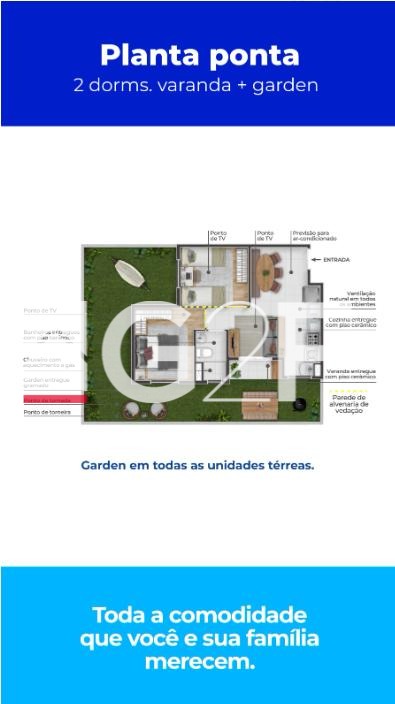 O condomínio conta com apartamentos de 2 dormitórios, com plantas modernas e funcionais de aproximadamente 41 a 42 m², incluindo sala para dois ambientes, cozinha, área de serviço, banheiro, varanda e 1 vaga de garagem. Algumas unidades térreas possuem opção garden, com quintal privativo, proporcionando ainda mais conforto aos moradores.