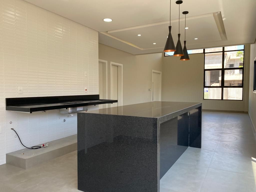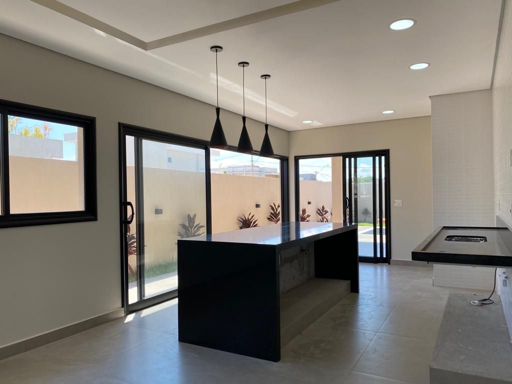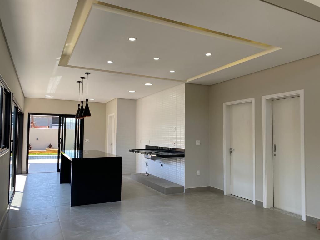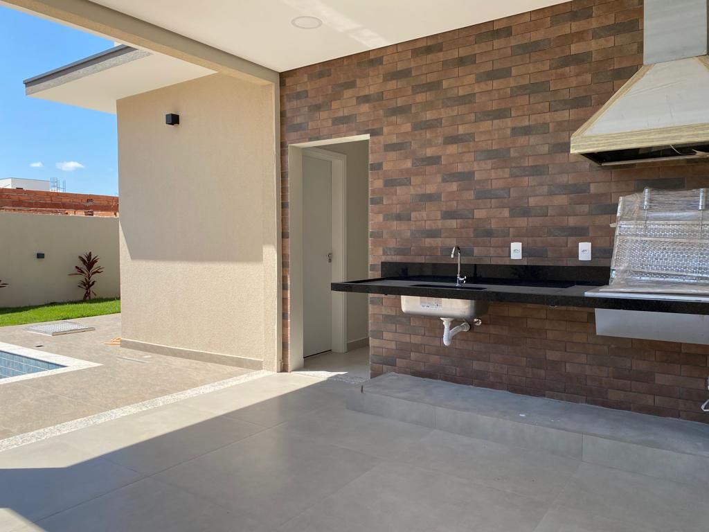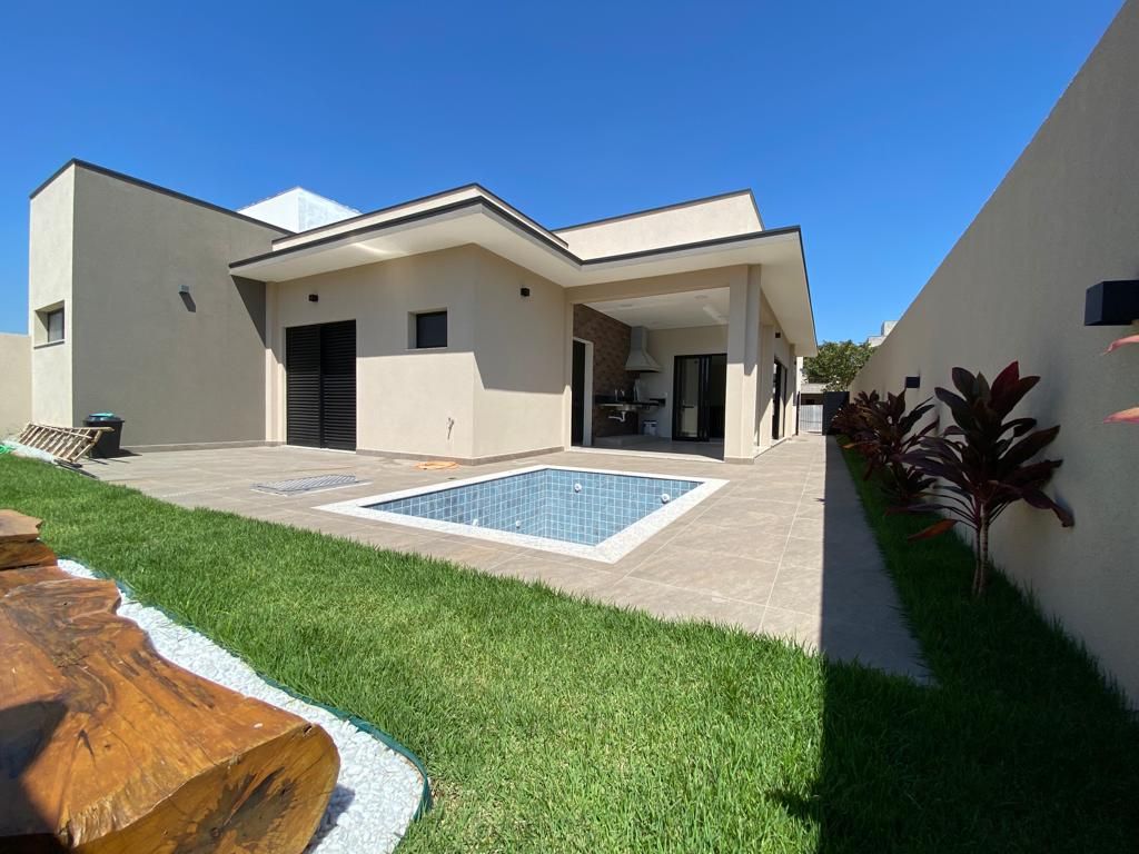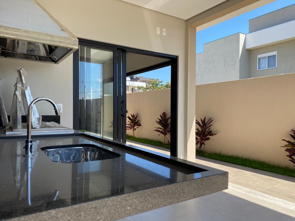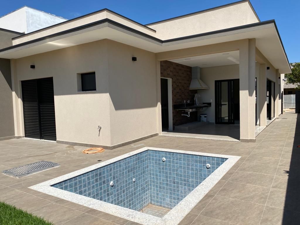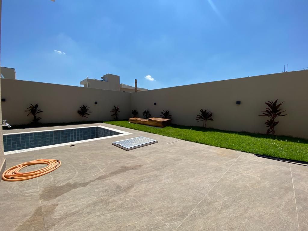 Casa térrea com 194 m² de área construída com 360 m² de terreno plano, parte alto do condomínio, com 3 quartos, 3 suítes, sala com pé direito duplo integrado com a cozinha tipo americana, armário na garagem, área de serviço, quintal com piscina e churrasqueira, 4 vagas de garagem sendo 2 cobertas.