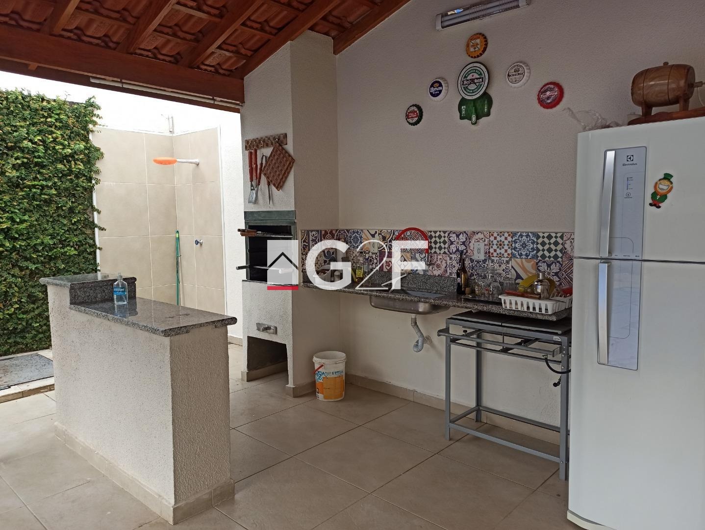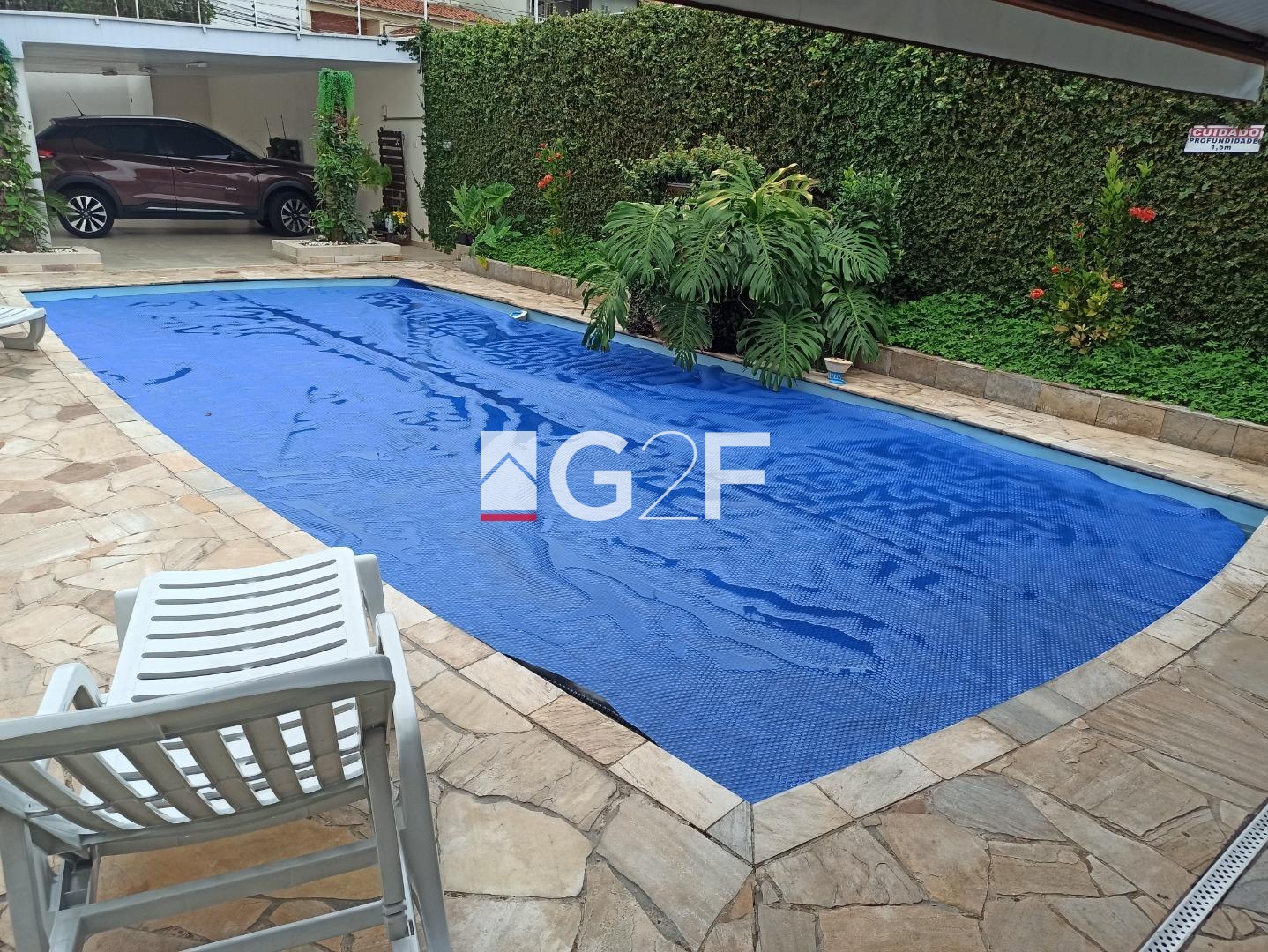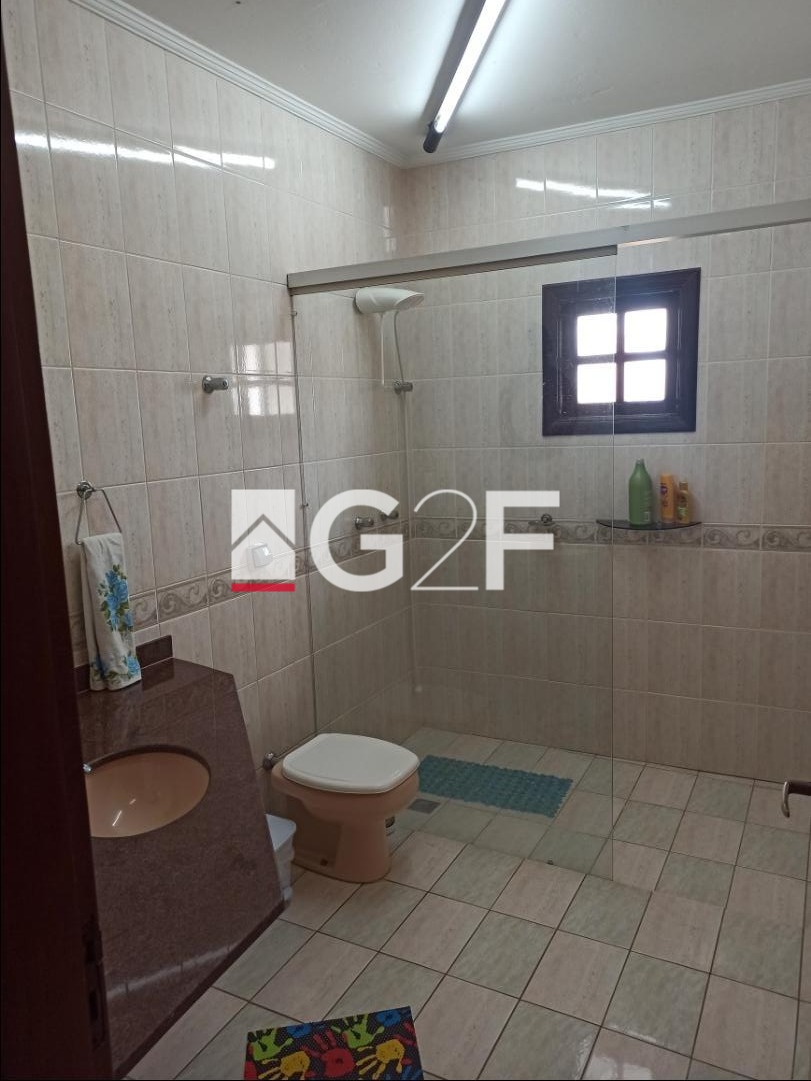 Área de lazer com churrasqueira, ducha, dois banheiros, pergolado para plantas, piscina com cascata. Toda área externa em porcelanato. Garagem coberta para 3 carros e mais 5 vagas descobertas.