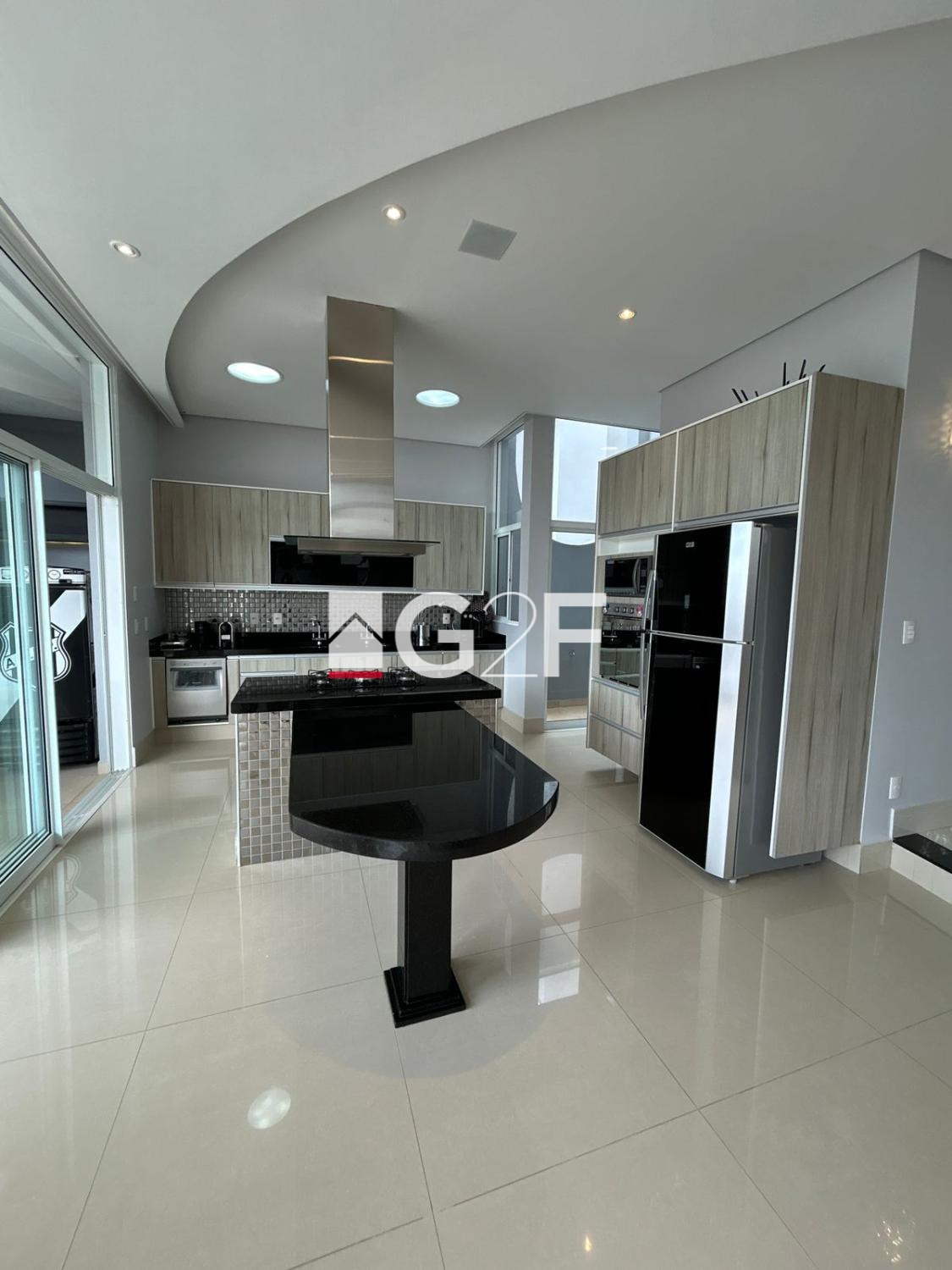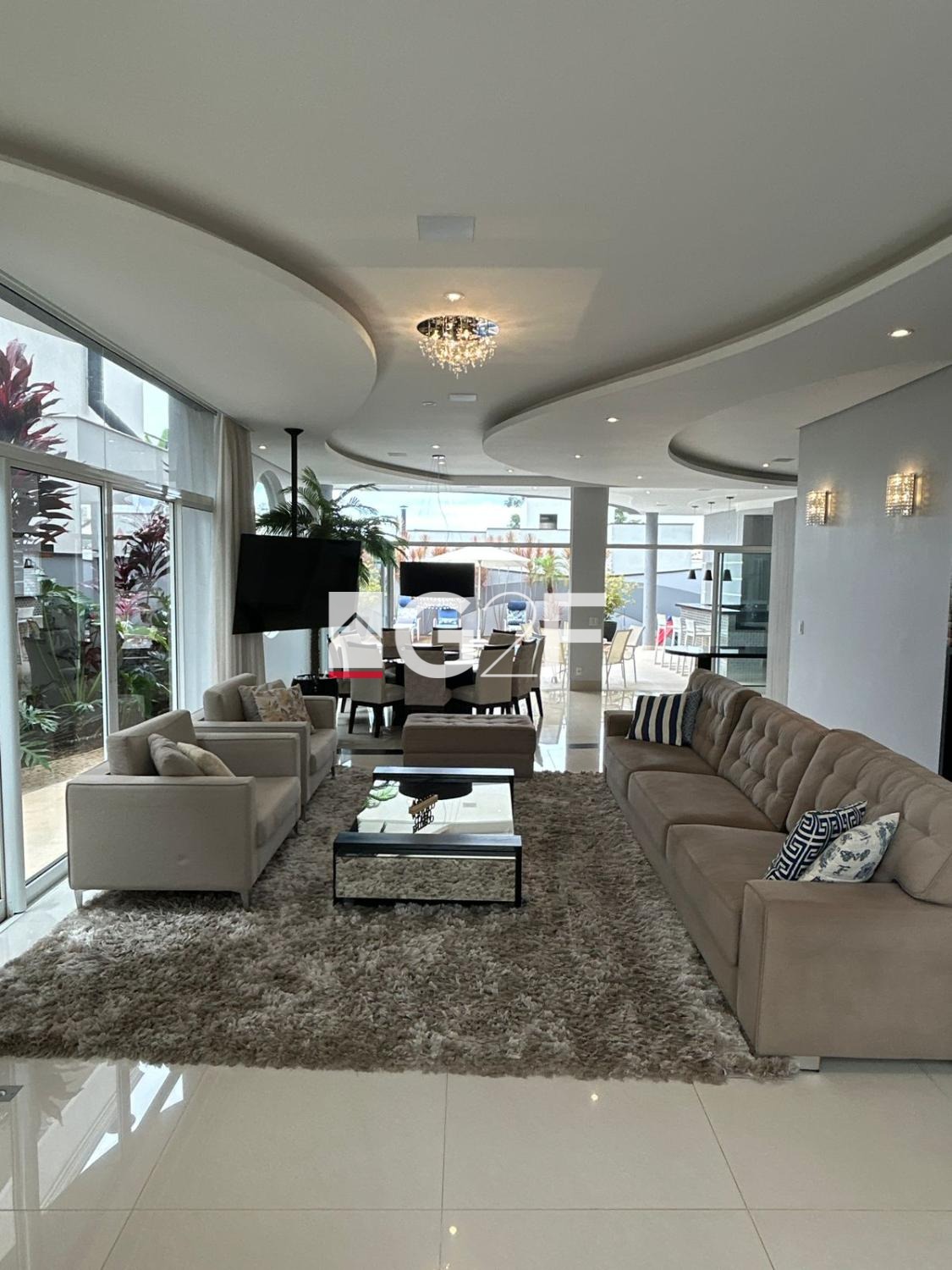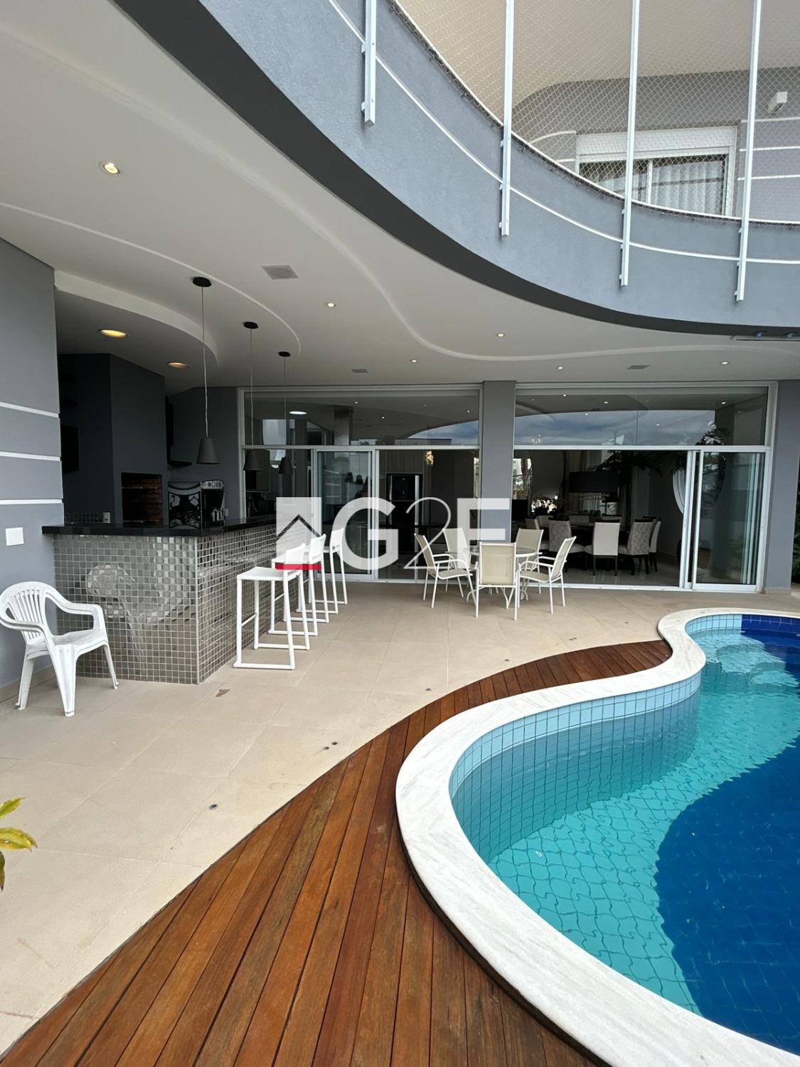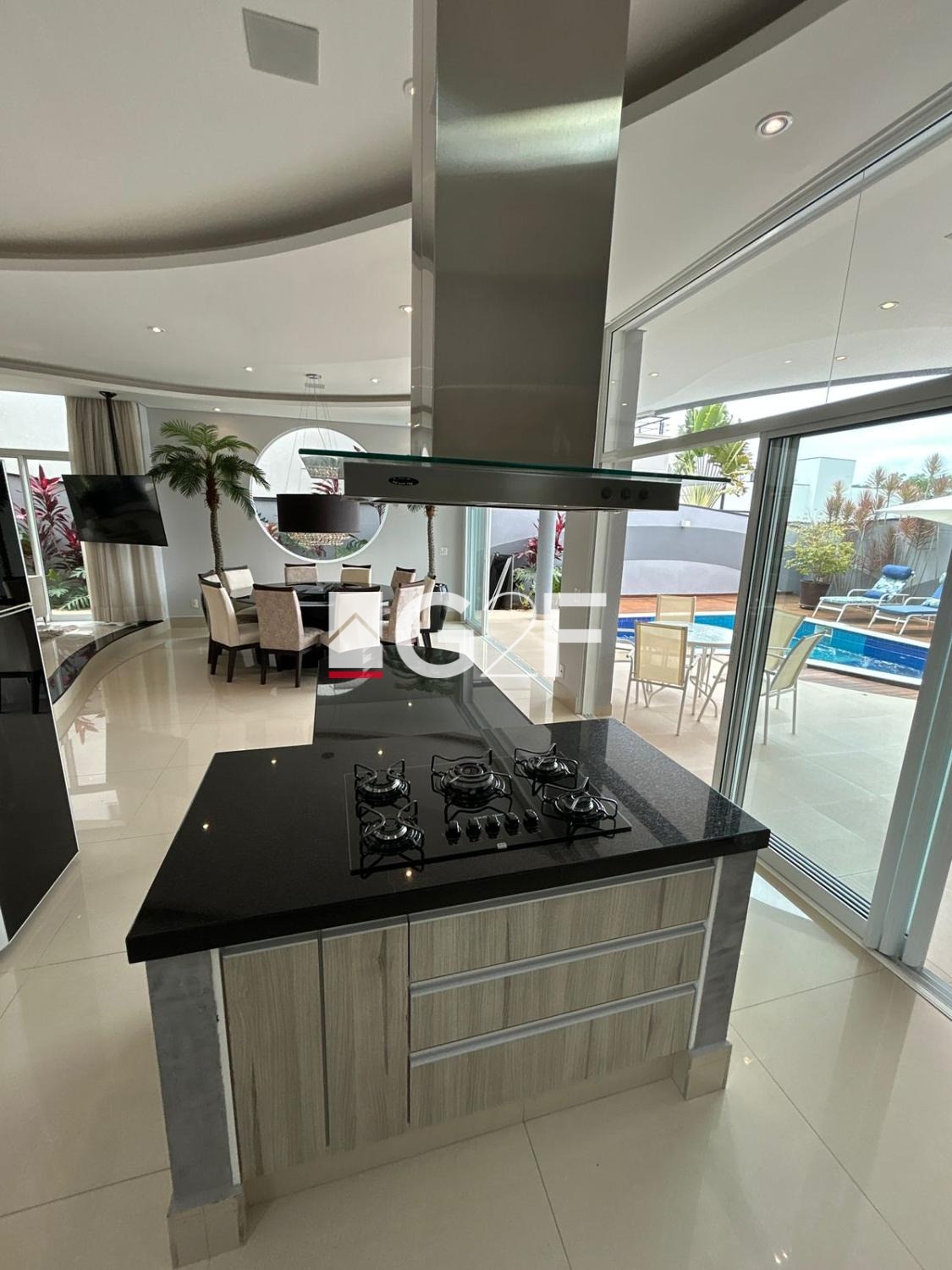 Parte inferior com sala integrada para 2 ambientes, com um Home Bar, lavabo, uma bela cozinha espaçosa com planejados, ilha gourmet, e despensa, área de serviços, espaço gourmet com churrasqueira, piscina com cascata iluminada.