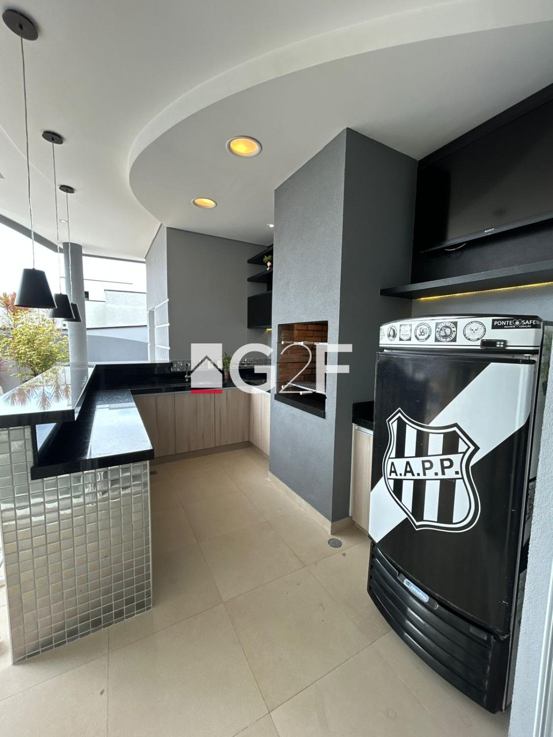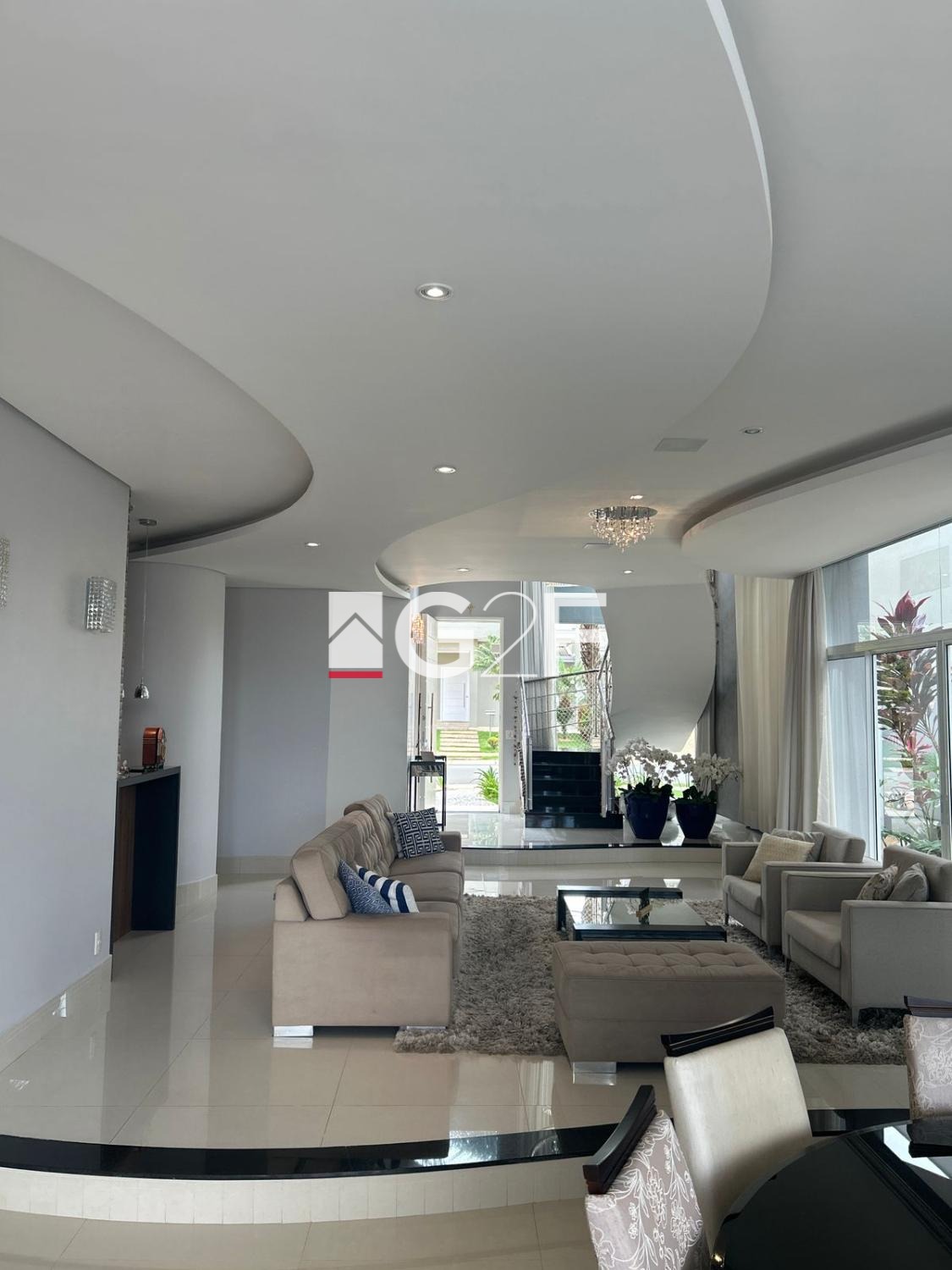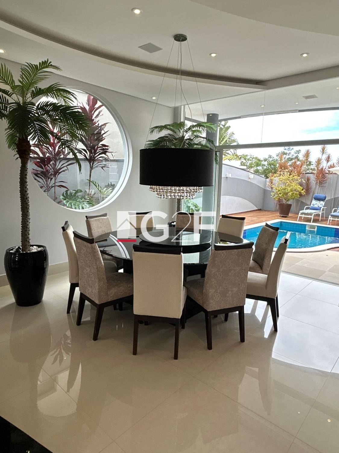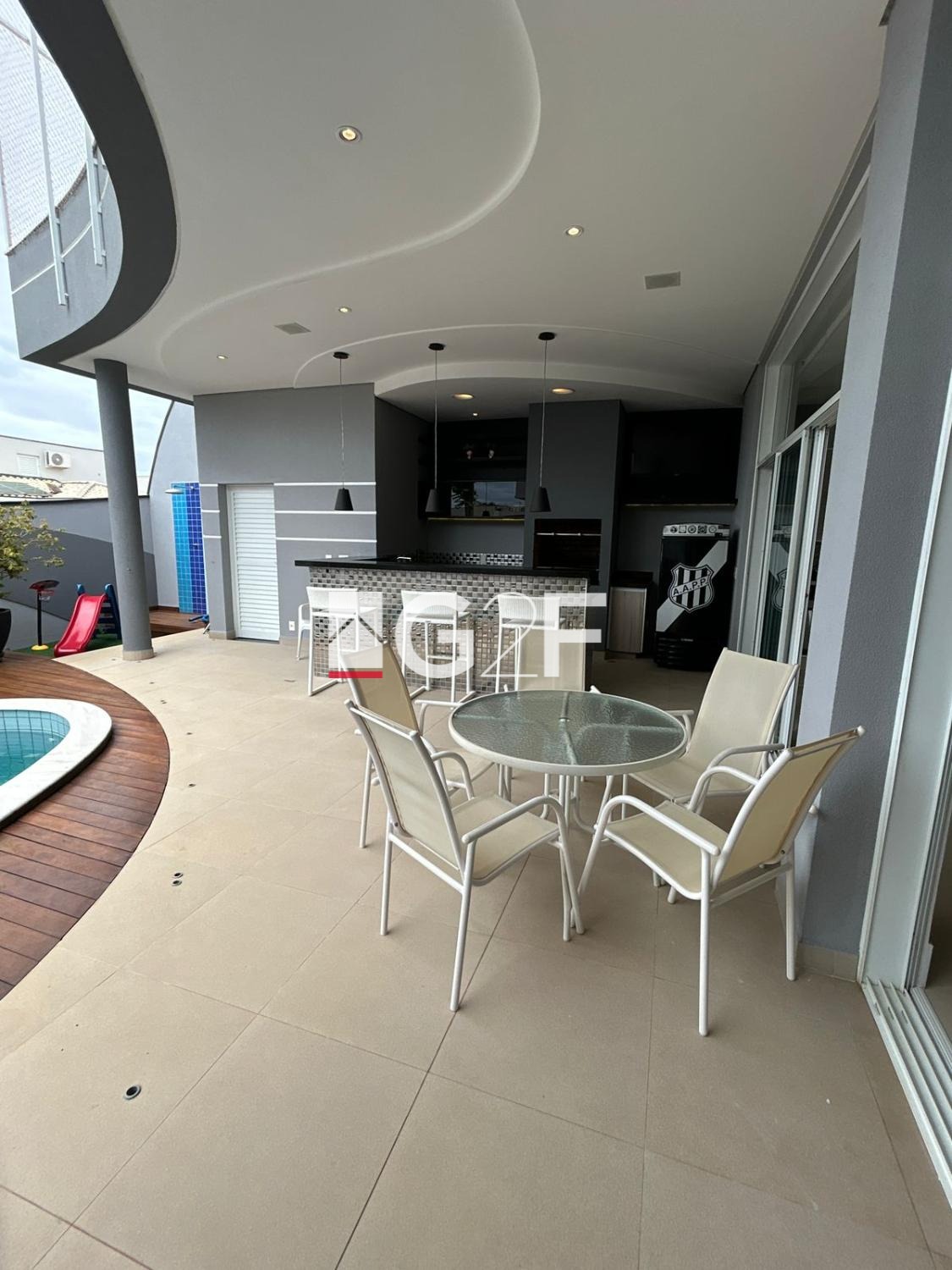 Parte inferior com sala integrada para 2 ambientes, com um Home Bar, lavabo, uma bela cozinha espaçosa com planejados, ilha gourmet, e despensa, área de serviços, espaço gourmet com churrasqueira, piscina com cascata iluminada.