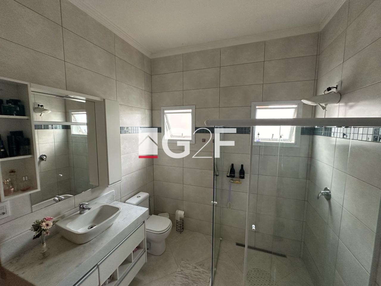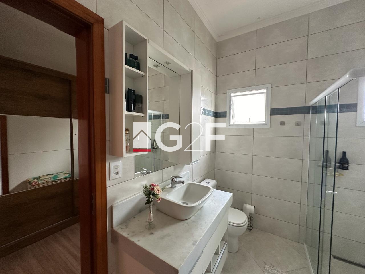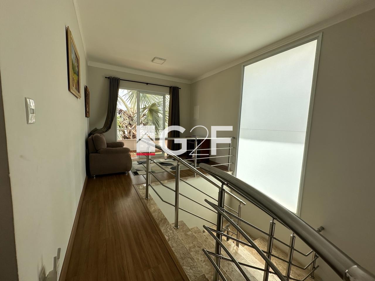 No andar superior, uma sala íntima acolhedora é ideal para momentos de relaxamento em família. A casa possui três suítes amplas, todas com banheiros bem espaçosos e equipados com blindex. A suíte master destaca-se pelo seu closet e pelo espaço generoso. Todos os quartos possuem sacadas, proporcionando excelente ventilação e iluminação natural.