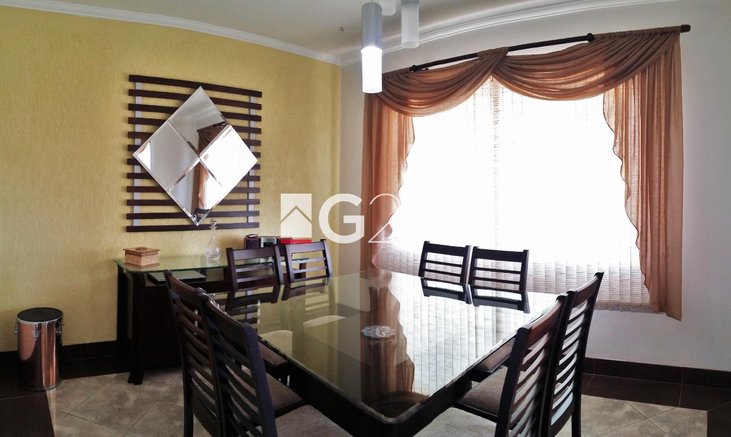O segundo pavimento (térreo) construído com o pé direito duplo, amplo living com texturas, 1 quarto/escritório, piso em porcelanato, lavabo, sala de jantar com textura e porcelanato, cozinha planejada, ampla lavanderia, escada para acesso ao terceiro pavimento em madeira (jatobá), portas e batentes em madeira jatobá, aquecimento solar, 3 garagens cobertas e 2 garagens não cobertas, portão eletrônico, cerca elétrica.