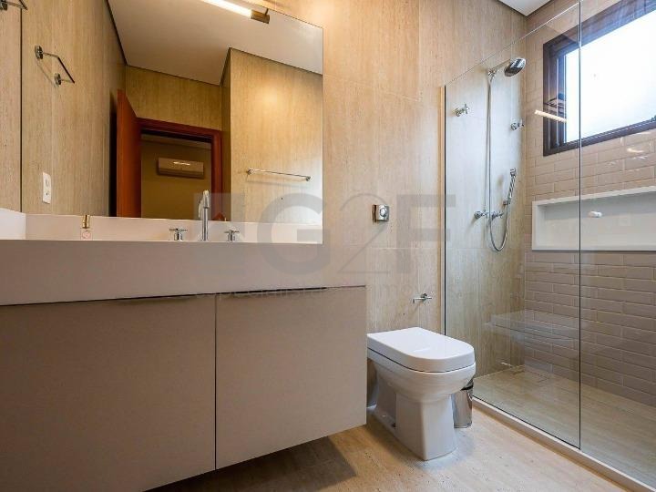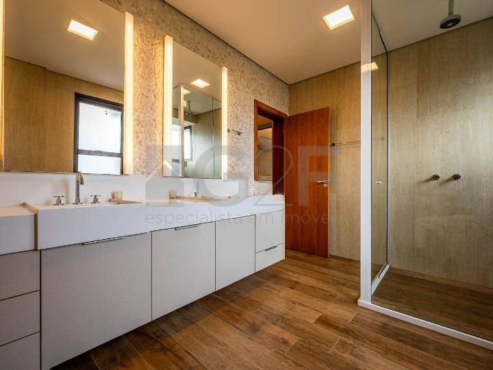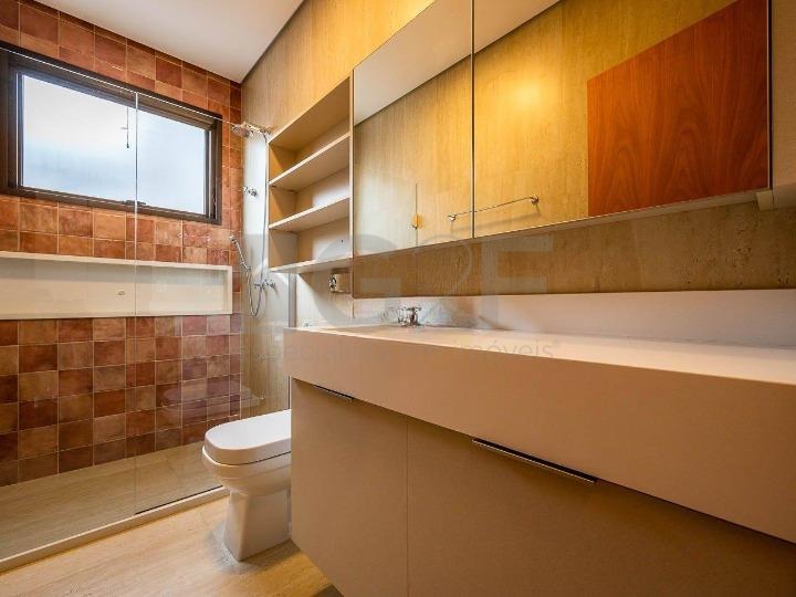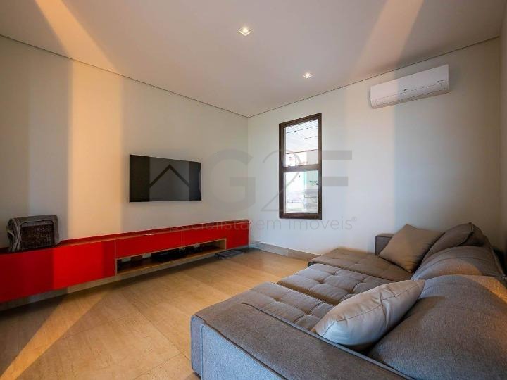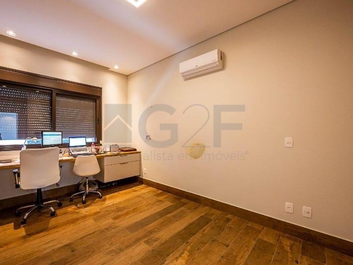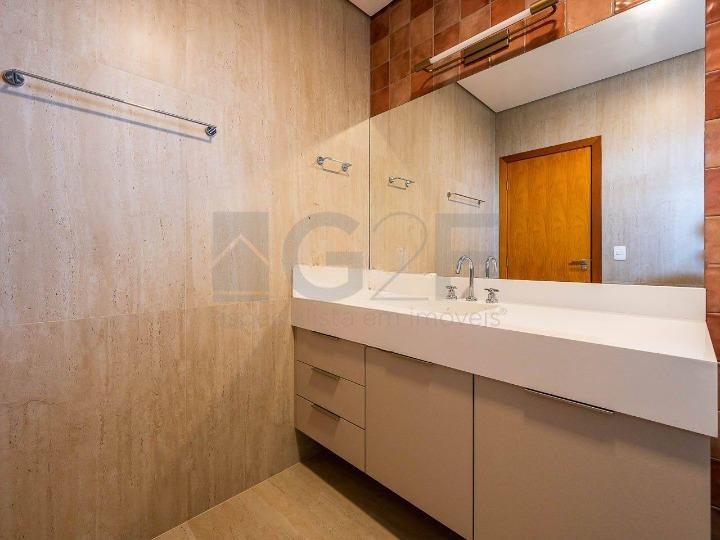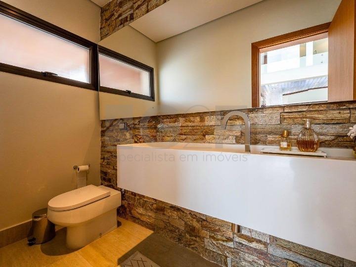Para entretenimento, um home cinema proporciona momentos de lazer e diversão para toda a família. O lavabo, com seu design impecável, é um exemplo adicional da atenção aos detalhes que permeia toda a residência.