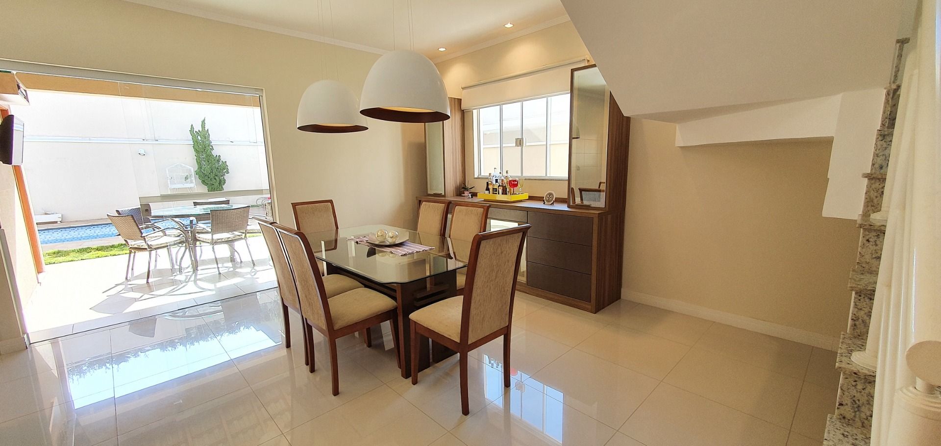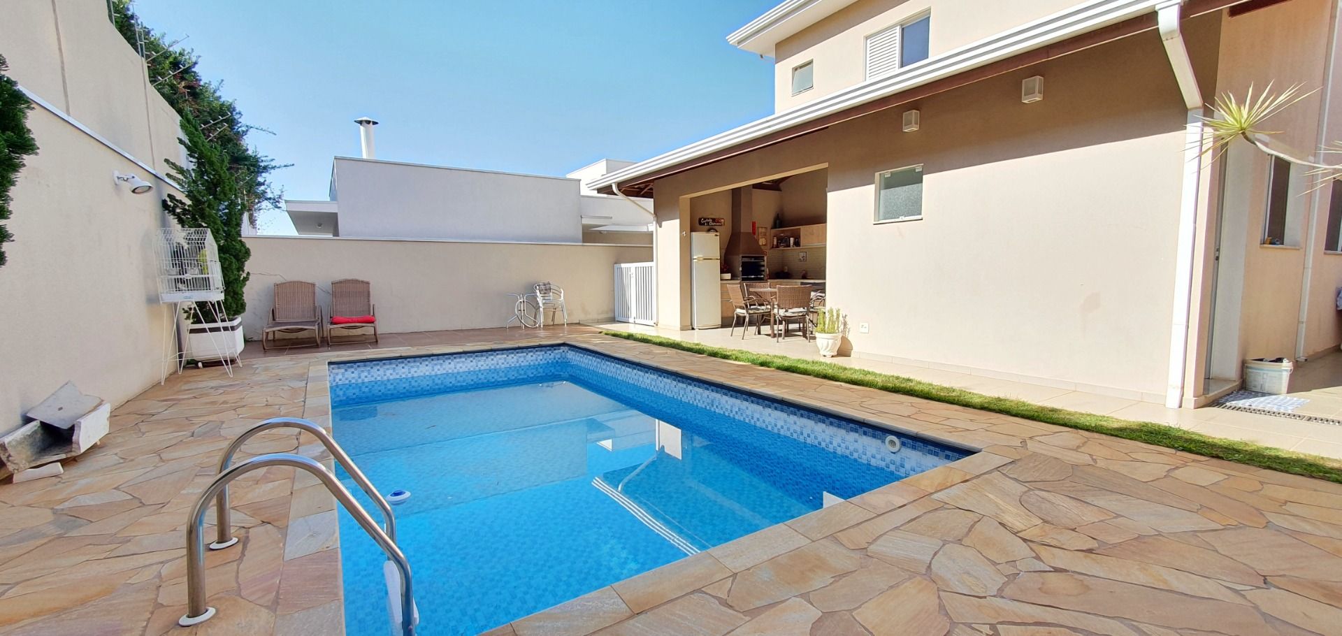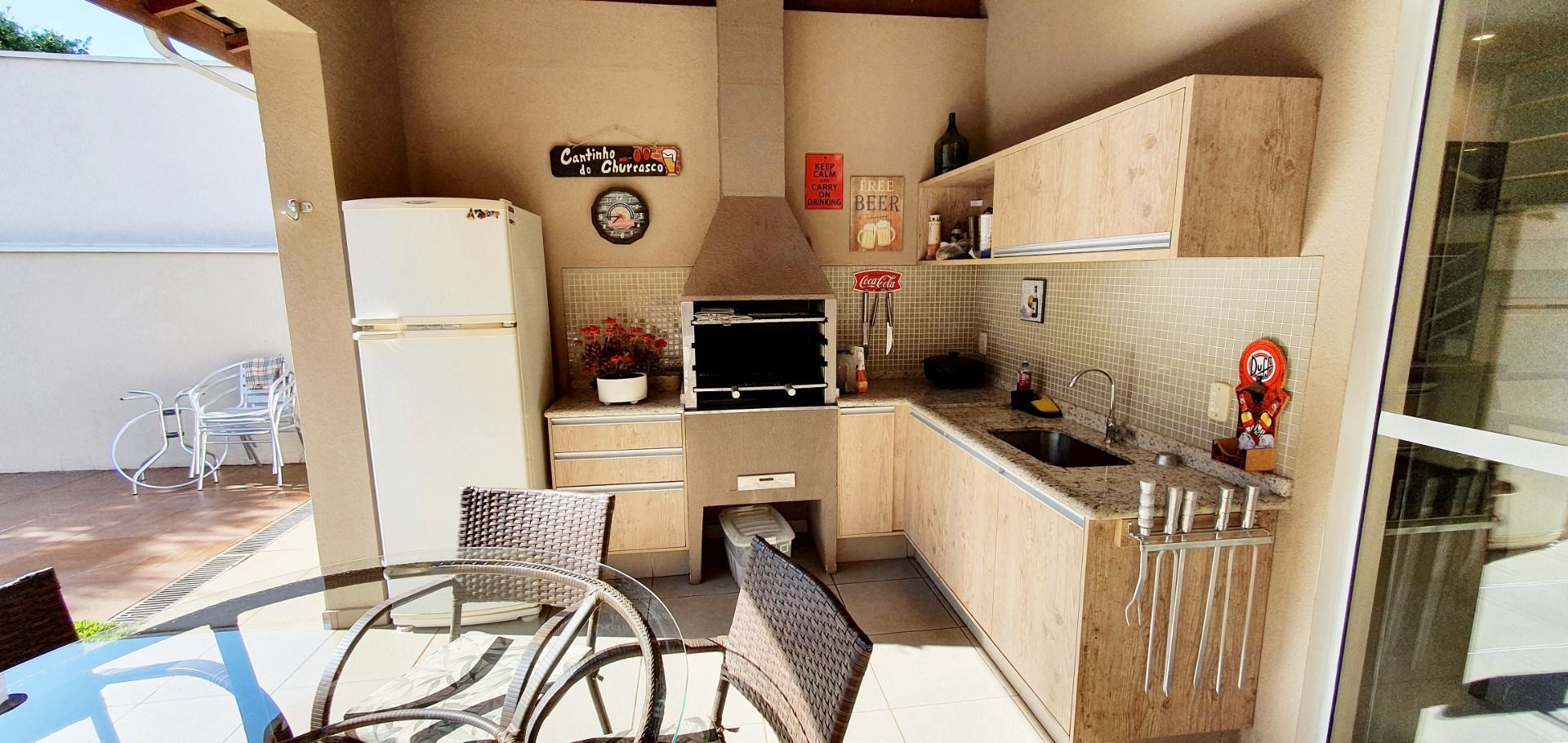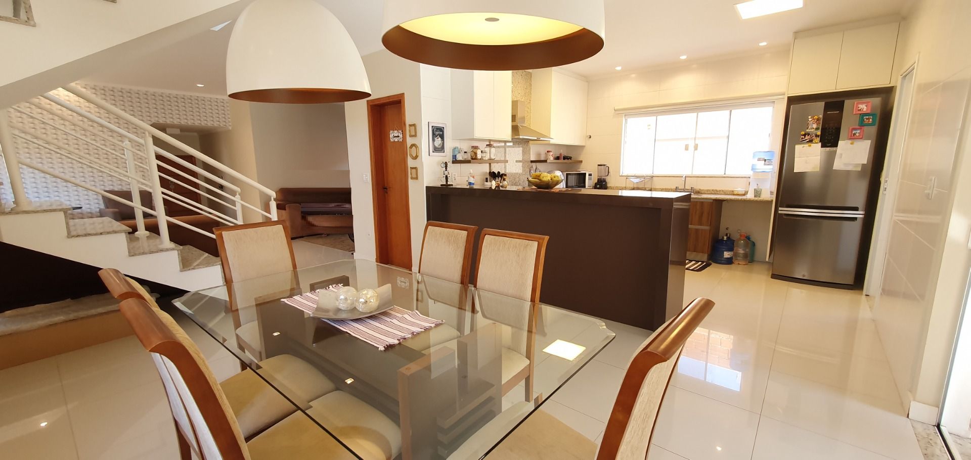 Sobrado com acabamento impecável, amplo living para 3 ambientes, piso em porcelanato, lavabo, cozinha americana planejada, 3 suítes com armários planejados. Varanda gourmet com churrasqueira, piscina e amplo quintal. Garagem com 2 vagas cobertas veículos. Condomínio com ótima estrutura de lazer: piscina, quadra poliesportiva, salão de festas e churrasqueira.