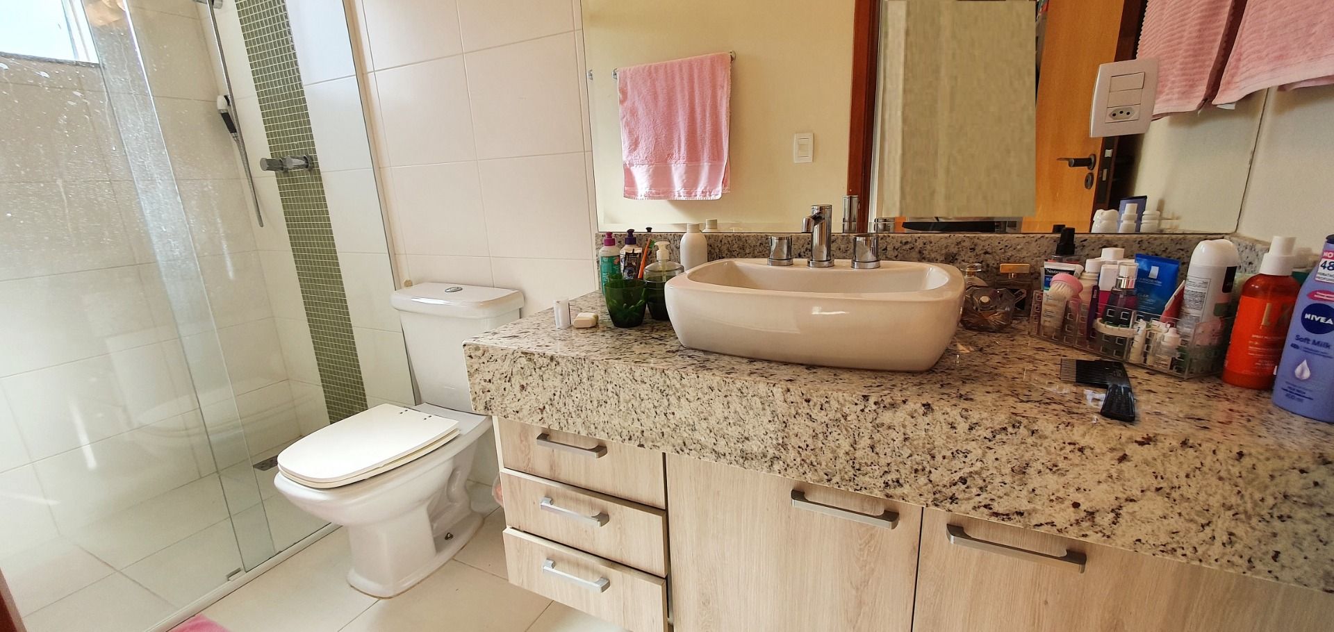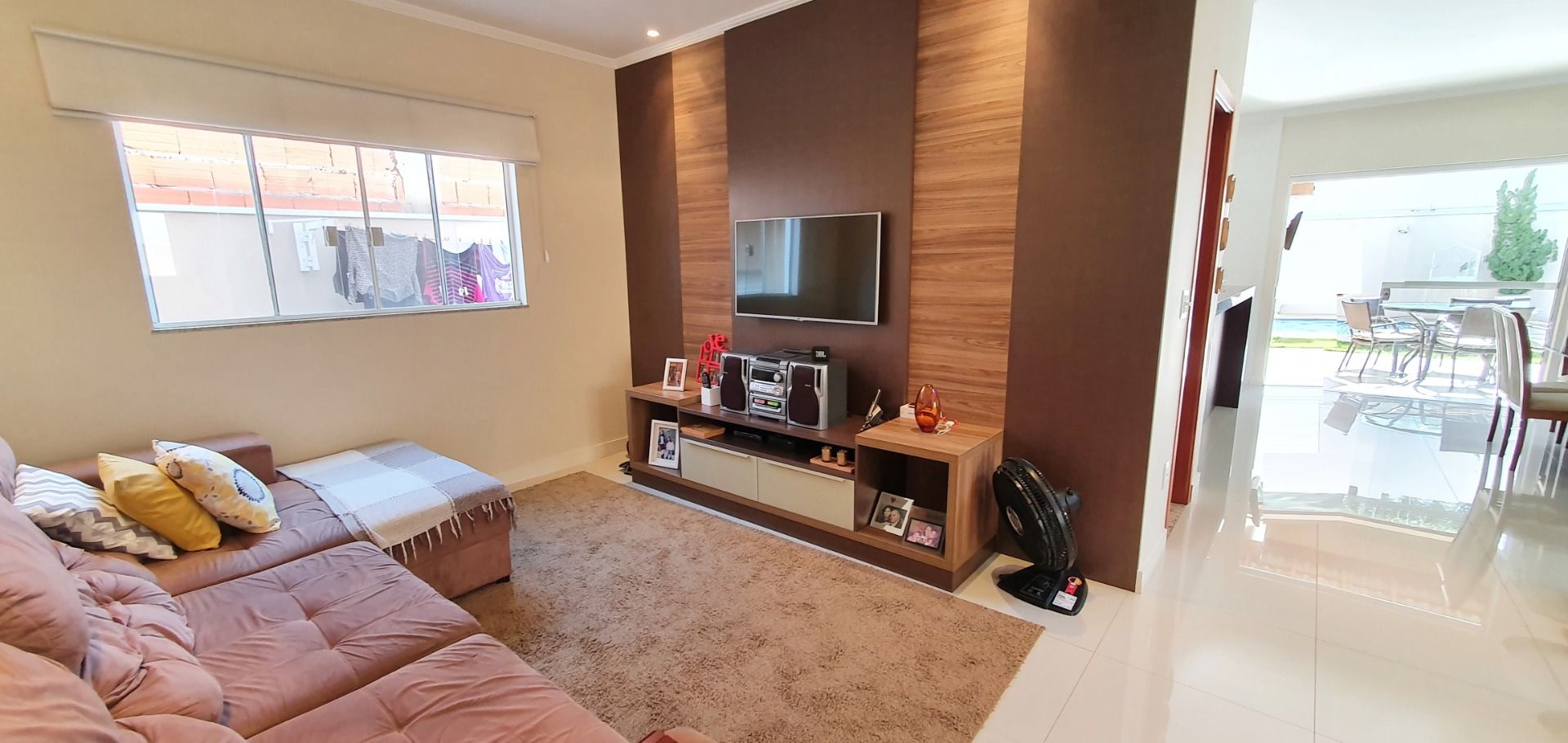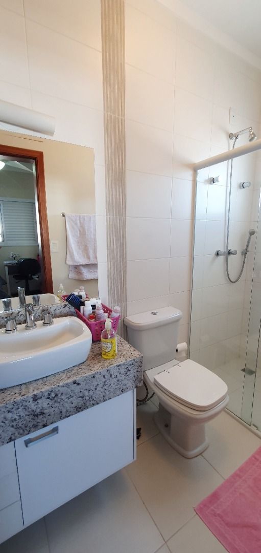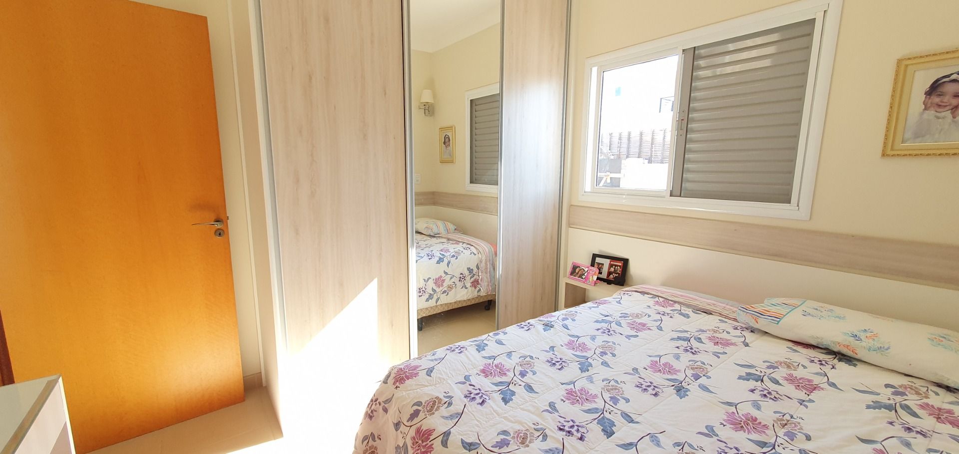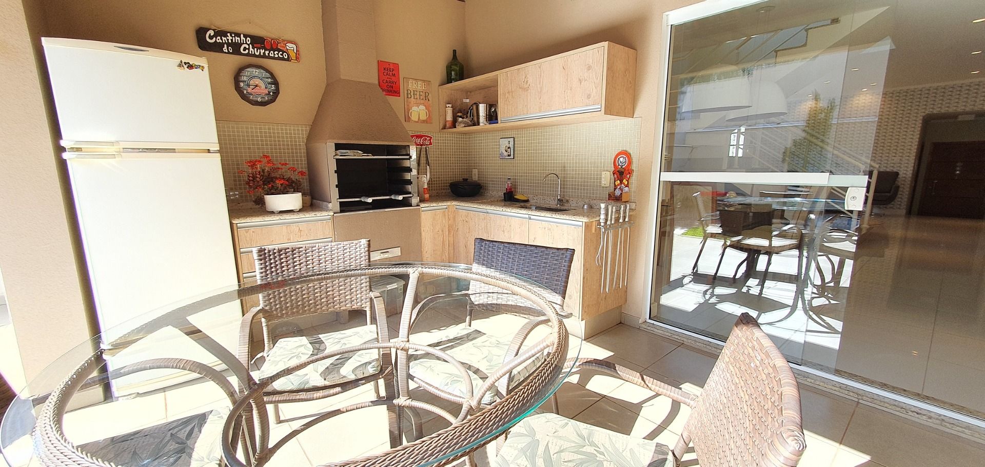 Sobrado com acabamento impecável, amplo living para 3 ambientes, piso em porcelanato, lavabo, cozinha americana planejada, 3 suítes com armários planejados. Varanda gourmet com churrasqueira, piscina e amplo quintal. Garagem com 2 vagas cobertas veículos. Condomínio com ótima estrutura de lazer: piscina, quadra poliesportiva, salão de festas e churrasqueira.