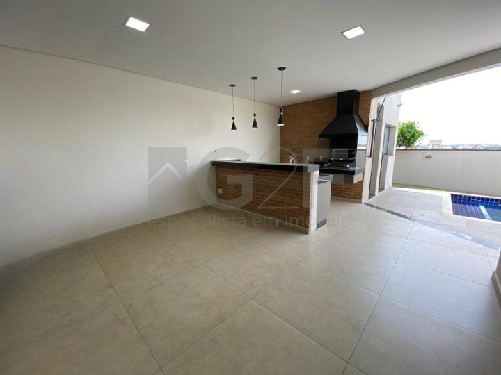 A piscina com prainha, espaço gourmet com churrasqueira e cooktop.