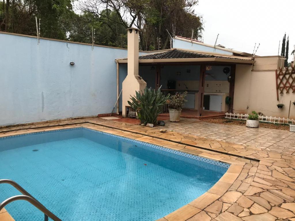 Lazer com piscina e quiosque com churrasqueira e uma bancada com pia.