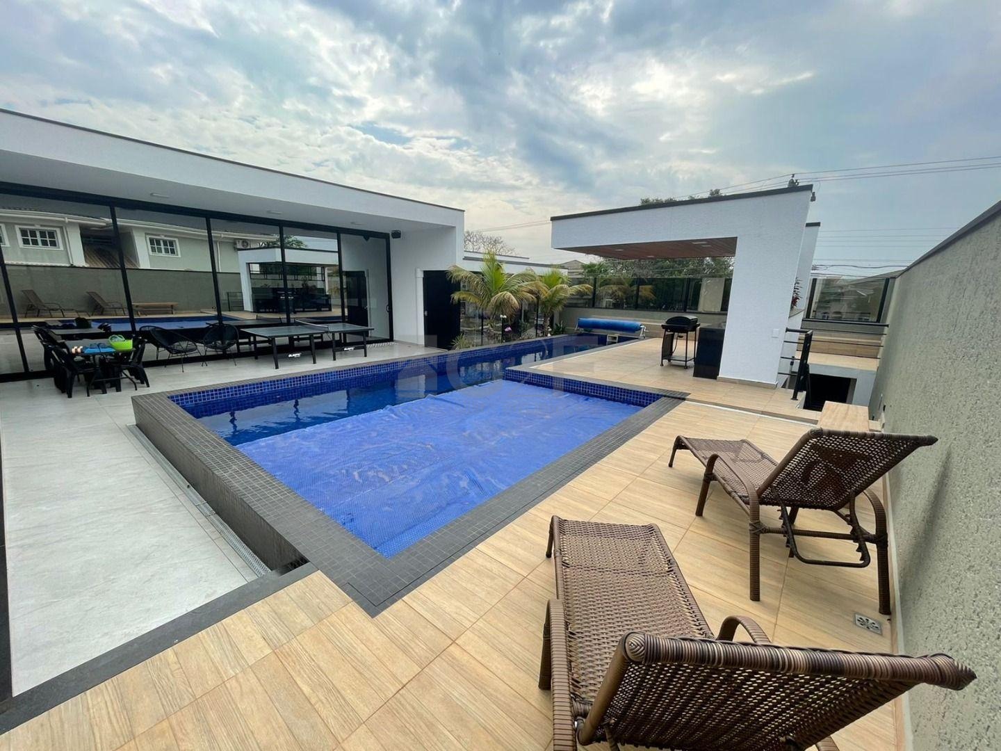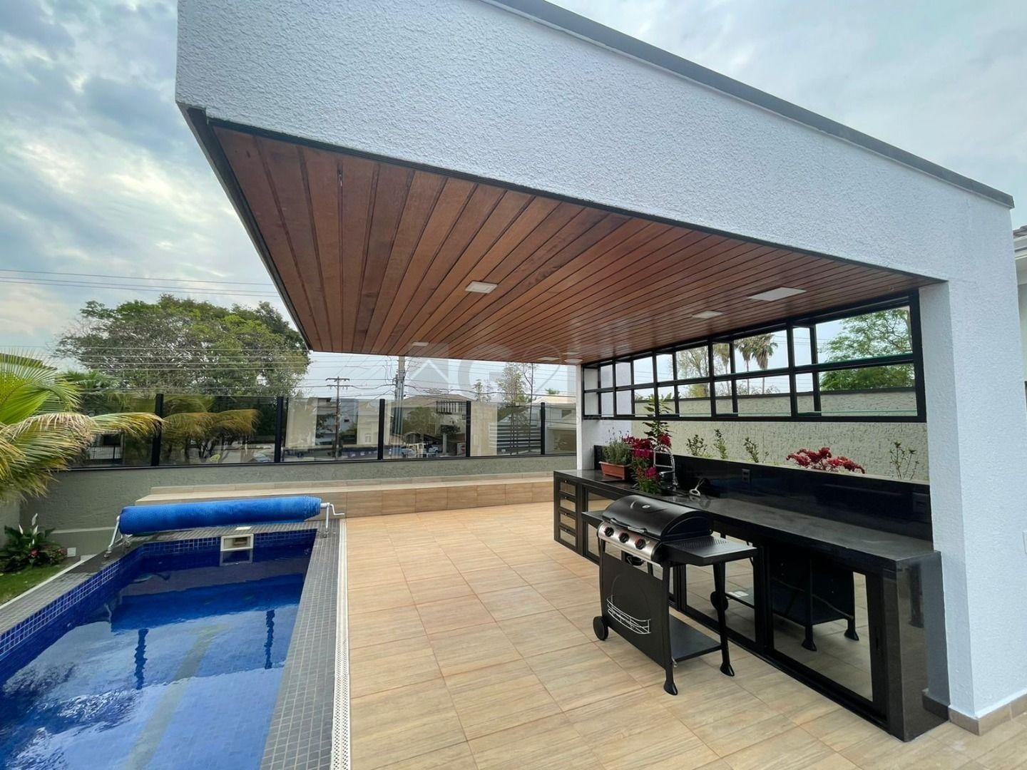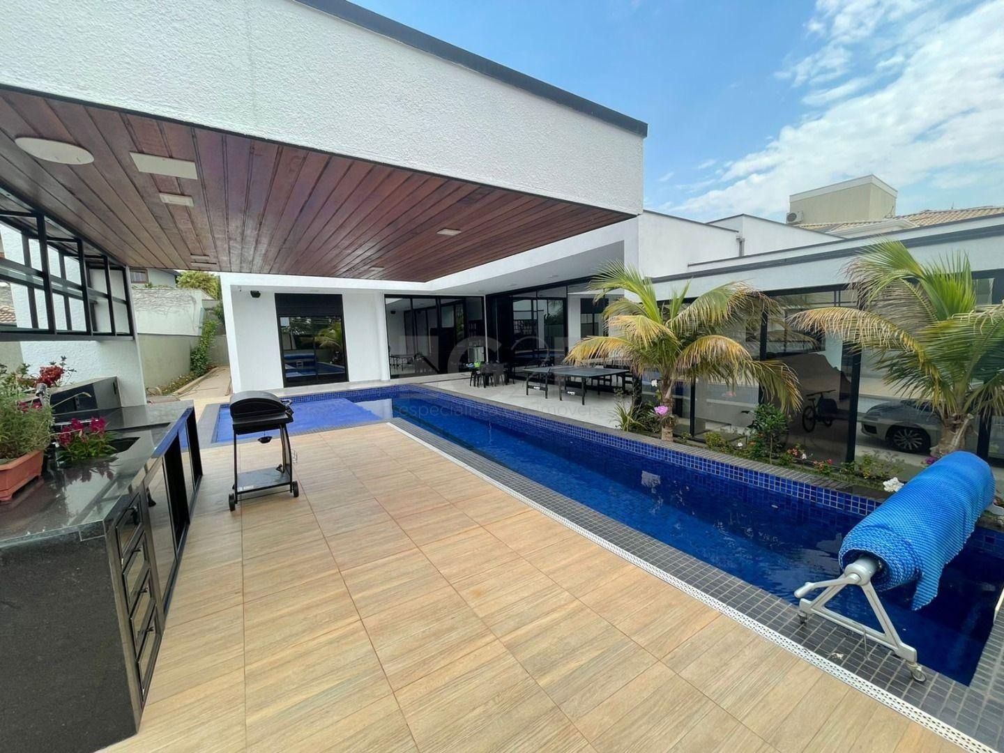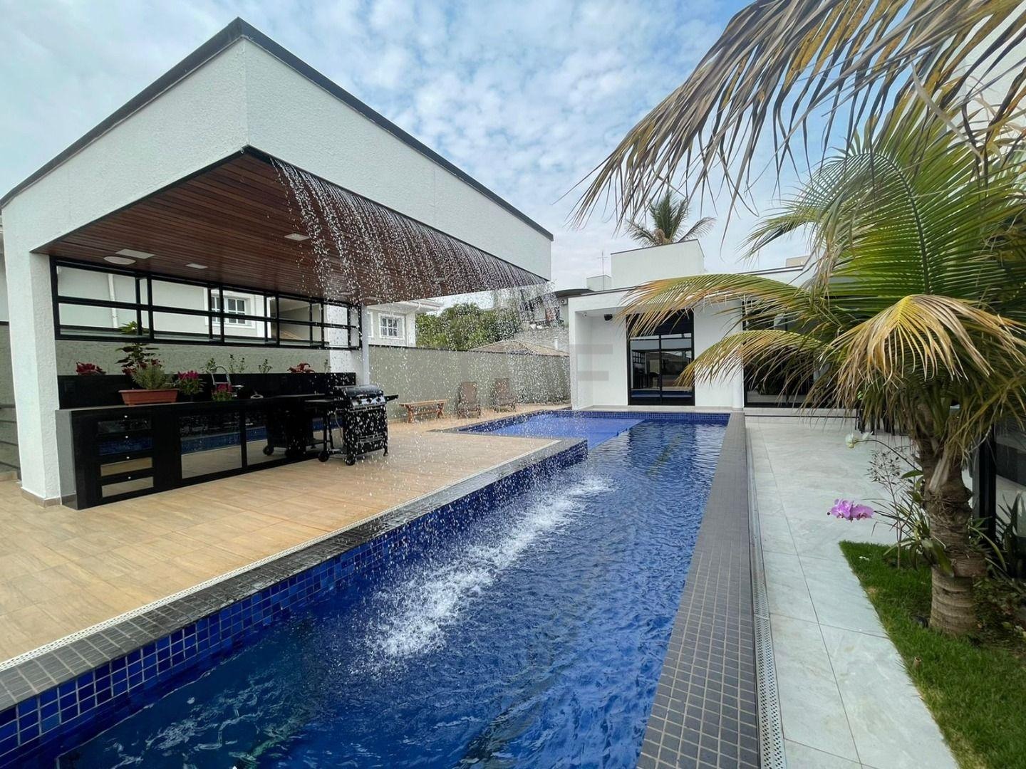Casa Térrea com fino acabamento e sofisticação construída com ambientes amplos, bem iluminados e arejados, totalmente clean. 4 suítes com pé direito de 3,3 m ricas em armários sendo 1 master com closet e hidro. Área social integrada, living com pé direito de 3,70 m, cozinha estilo americana totalmente planejada e espaço gourmet, escritório. Ar condicionado em todos ambientes. Sauna, piscina aquecida com cascata.42 m² placas solares para aquecimento da piscina.3 placas solares para duchas do banho. Reservatório de 10.000Lt de água de chuva.20 placas de energia fotovoltaica. Automação de lâmpadas, ar condicionados, TV, Home Theater e persianas, bombas das duchas piscina e da cascata. Paisagismo completo. Armários planejados: ROMANZZA.
