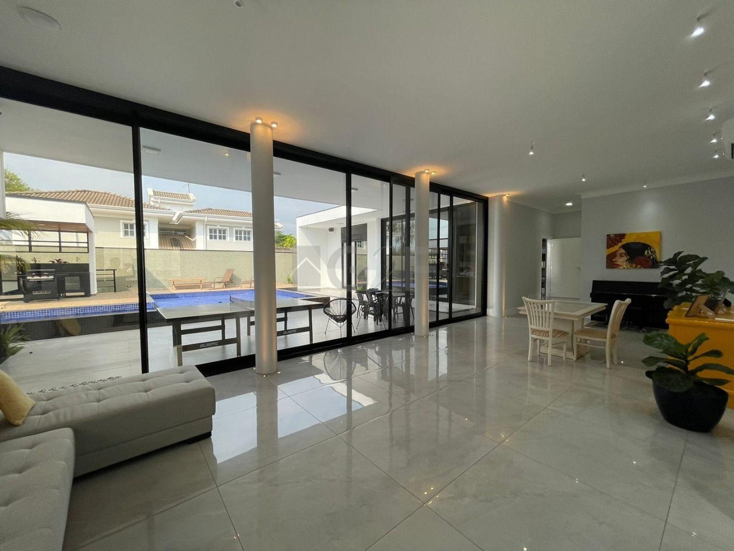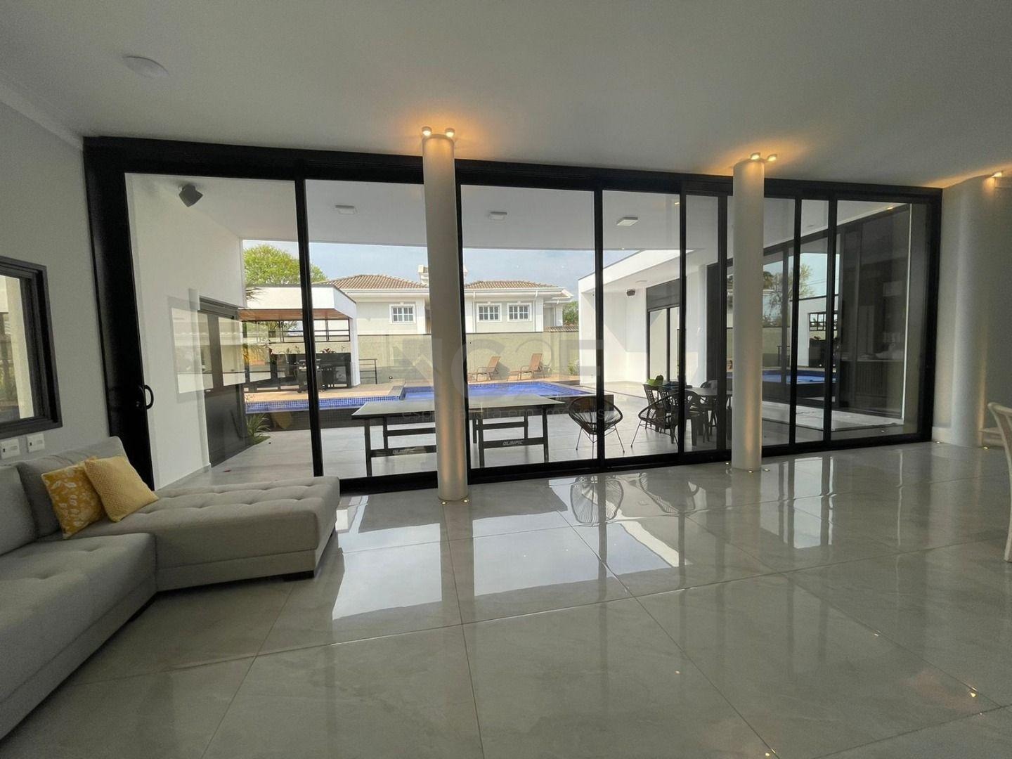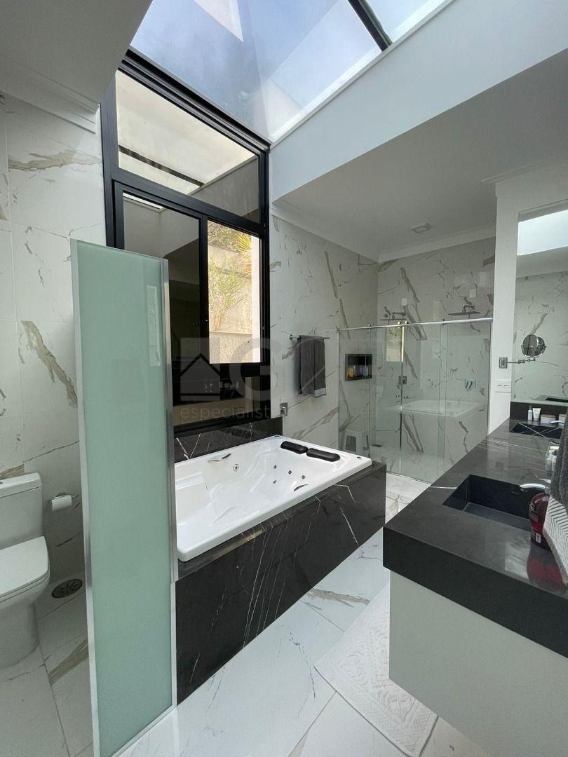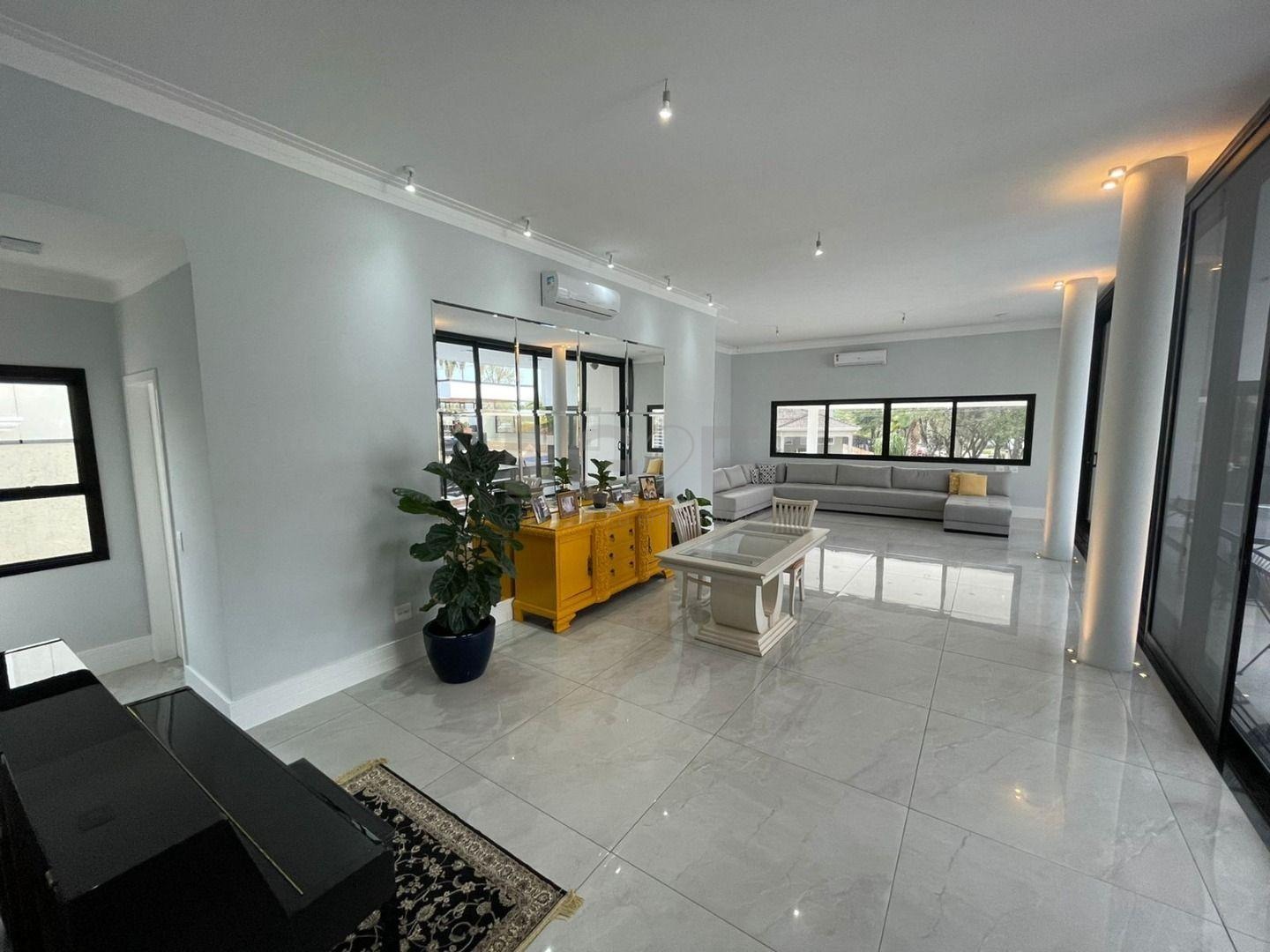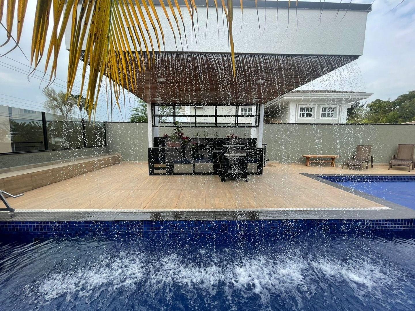 Casa Térrea com fino acabamento e sofisticação construída com ambientes amplos, bem iluminados e arejados, totalmente clean. 4 suítes com pé direito de 3,3 m ricas em armários sendo 1 master com closet e hidro. Área social integrada, living com pé direito de 3,70 m, cozinha estilo americana totalmente planejada e espaço gourmet, escritório. Ar condicionado em todos ambientes. Sauna, piscina aquecida com cascata.42 m² placas solares para aquecimento da piscina.3 placas solares para duchas do banho. Reservatório de 10.000Lt de água de chuva.20 placas de energia fotovoltaica. Automação de lâmpadas, ar condicionados, TV, Home Theater e persianas, bombas das duchas piscina e da cascata. Paisagismo completo. Armários planejados: ROMANZZA.