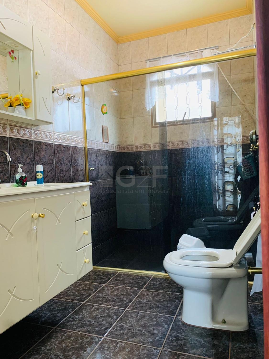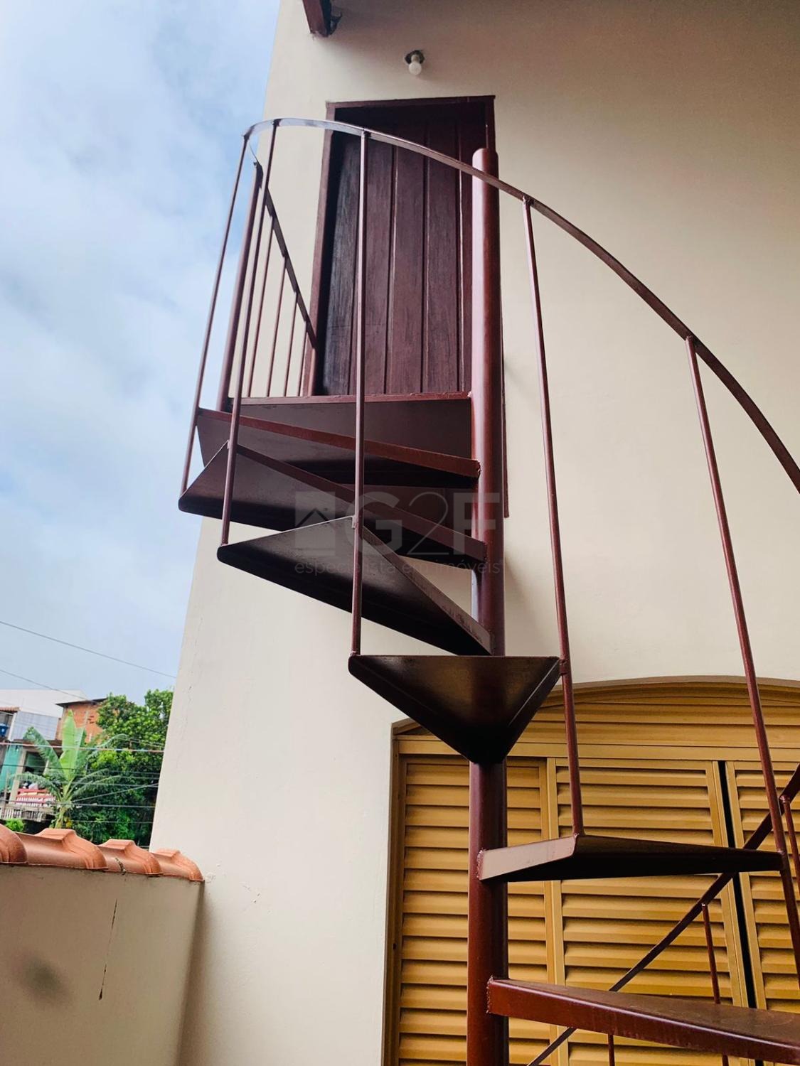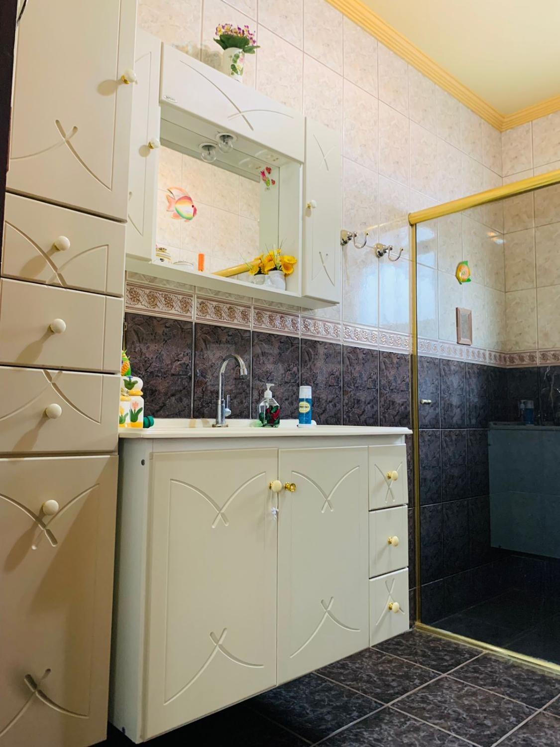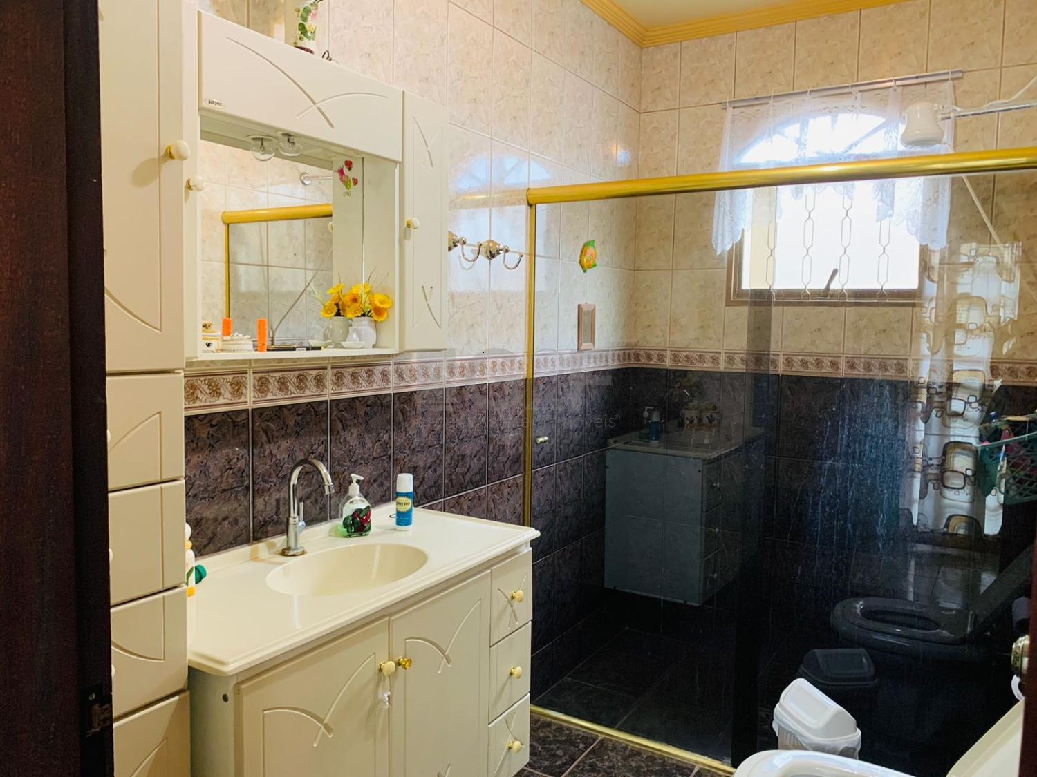 Parte de baixo, 3 quartos, 1 suíte, cozinha tipo americana, banheiro, quintal com 120m², e área gourmet com churrasqueira.