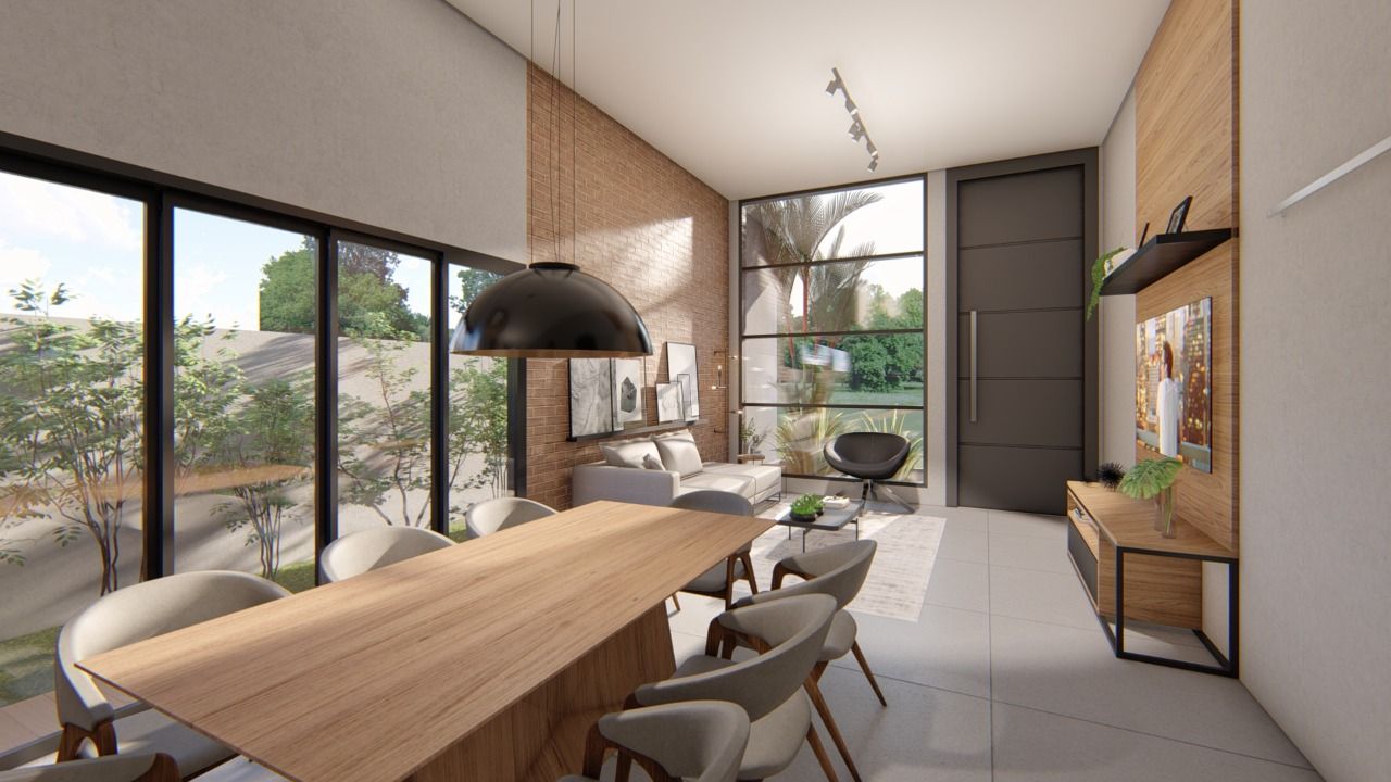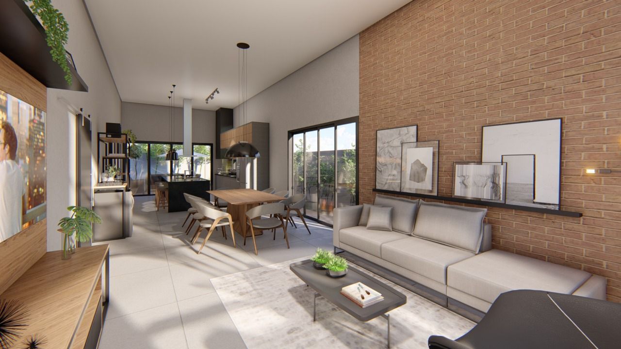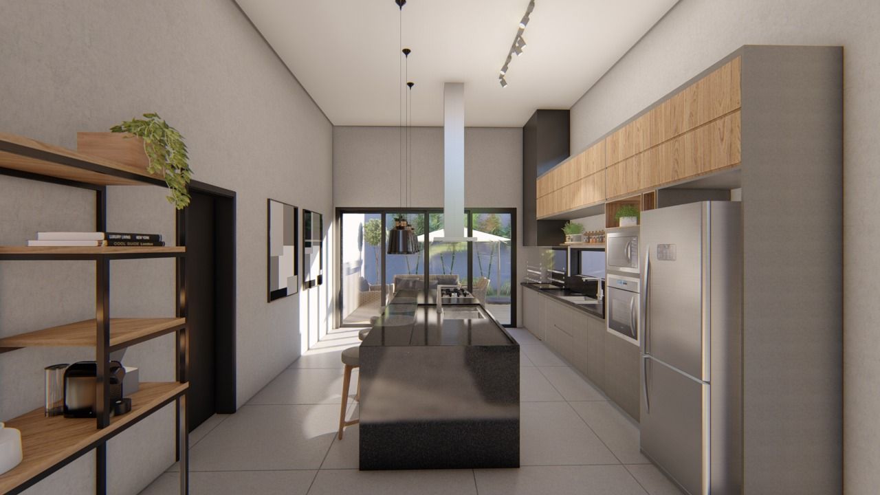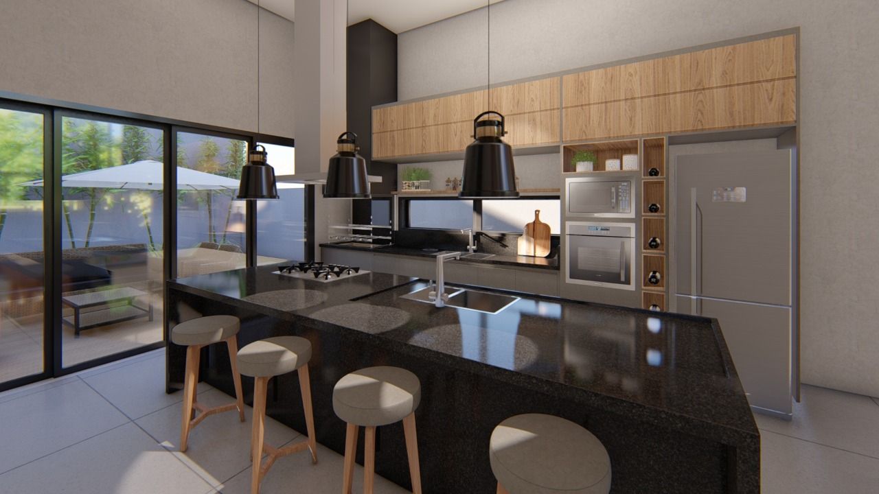 Casa térrea com sala ampla, ambiente todo livre espaço único, (living para 3 ambientes) infra para ar condicionado, cobertura em estrutura metálica com metalon quadrado preto e telhas termo acústicas em pintura eletrostática branca, painel de madeira para tv e prateleira decor. Cozinha tipo americana com coifa/ilha, cooktop 5 bocas, sendo 1 cuba na pia e outra na ilha com torneiras giratórias 360 graus. Armário parede lateral com espaço pata adega, forno, geladeira e outros espaços, gavetões na ilha e na pia parede, churrasqueira com base em granito preto em torno, coifa em chapa galvanizada preta com vidro de fechamento lateral em vidro, exaustão forçada para não ter fumaça interna na casa, portas nos fundos da casa de 2,40 de altura e abertura de 3,60 mts, vidros acima da porta com visual de portas com 4,80 de altura. Armário do lado embaixo da pia para itens da churrasqueira, lavanderia externa tanque em louça branca mais tubulação para máquina, varanda externa espaço fundos da casa com piso em porcelanato, área externa direto na área gourmet. Garagem para 4 veículos, com piso em porcelanato anti derrapante, cobertura em vigas h e coberta com telha sanduiche preta com lateral com sombrite. Parte superior com 2 cômodos com entrada independente, adequado para home office (reversível).