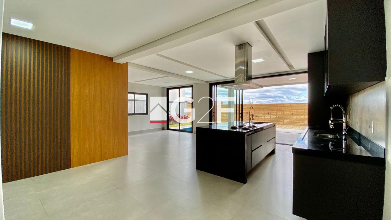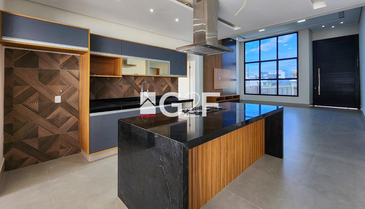 Living com pé direito alto, escritório, lavabo, cozinha com ilha integrada ao espaço gourmet.