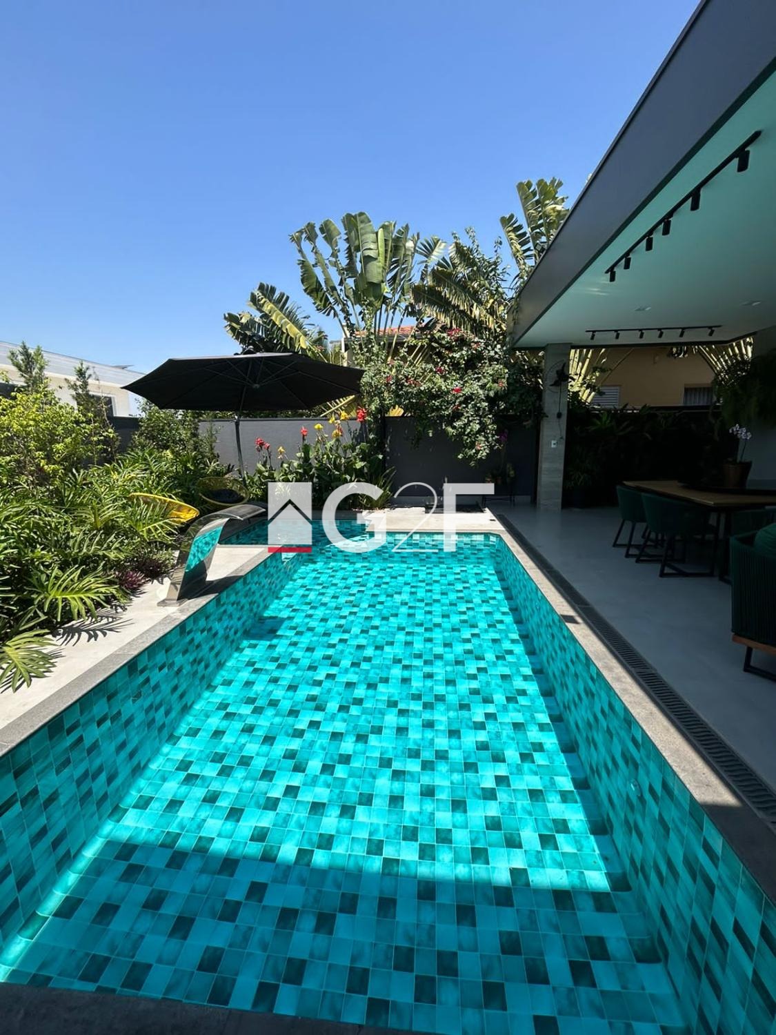 Na área gourmet, possui churrasqueira integrada com forno de pizza, ilha com cooktop. Piscina com hidromassagem e um quarto com banheiro.