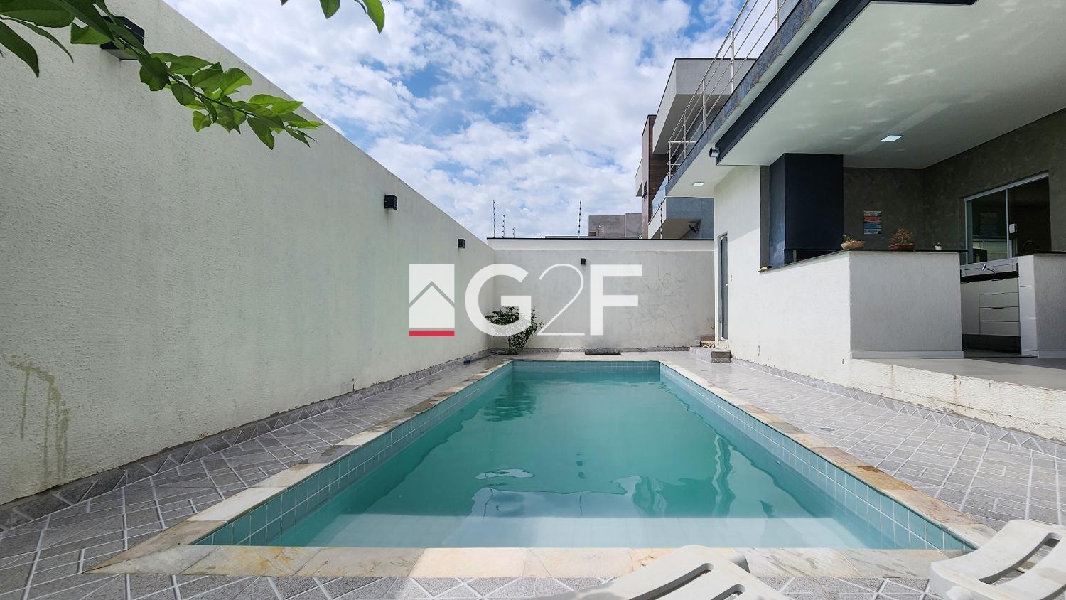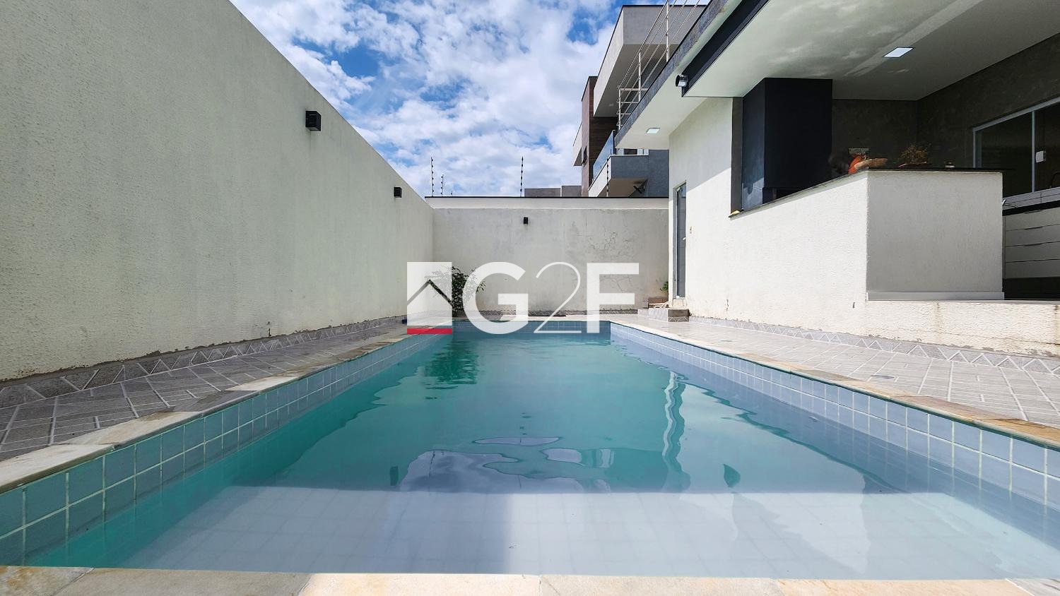 Condomínio com área de lazer com piscina, salão de festas e playground.