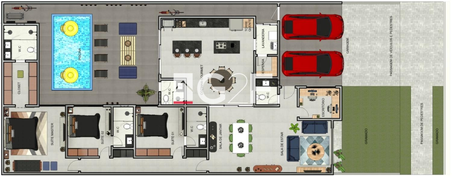 A casa possui 3 quartos, todos suítes, sendo uma suíte máster com closet, sala de estar/TV com pé direito duplo, sala de jantar, escritório, lavabo, cozinha Integrada com área gourmet, churrasqueira, piscina, quintal, banheiro externo, lavanderia fechada, despensa, ar condicionado em todos os ambientes, sistema de aquecimento solar, metais Deca, persianas automatizadas e 4 vagas, sendo 2 cobertas.