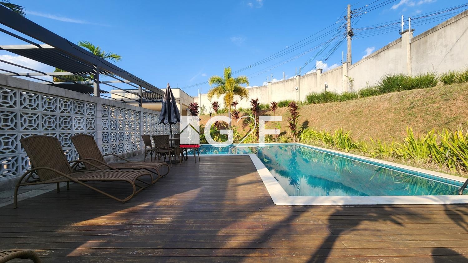 Piscina com iluminação, deck suspenso, lindo paisagismo e banheiro externo.