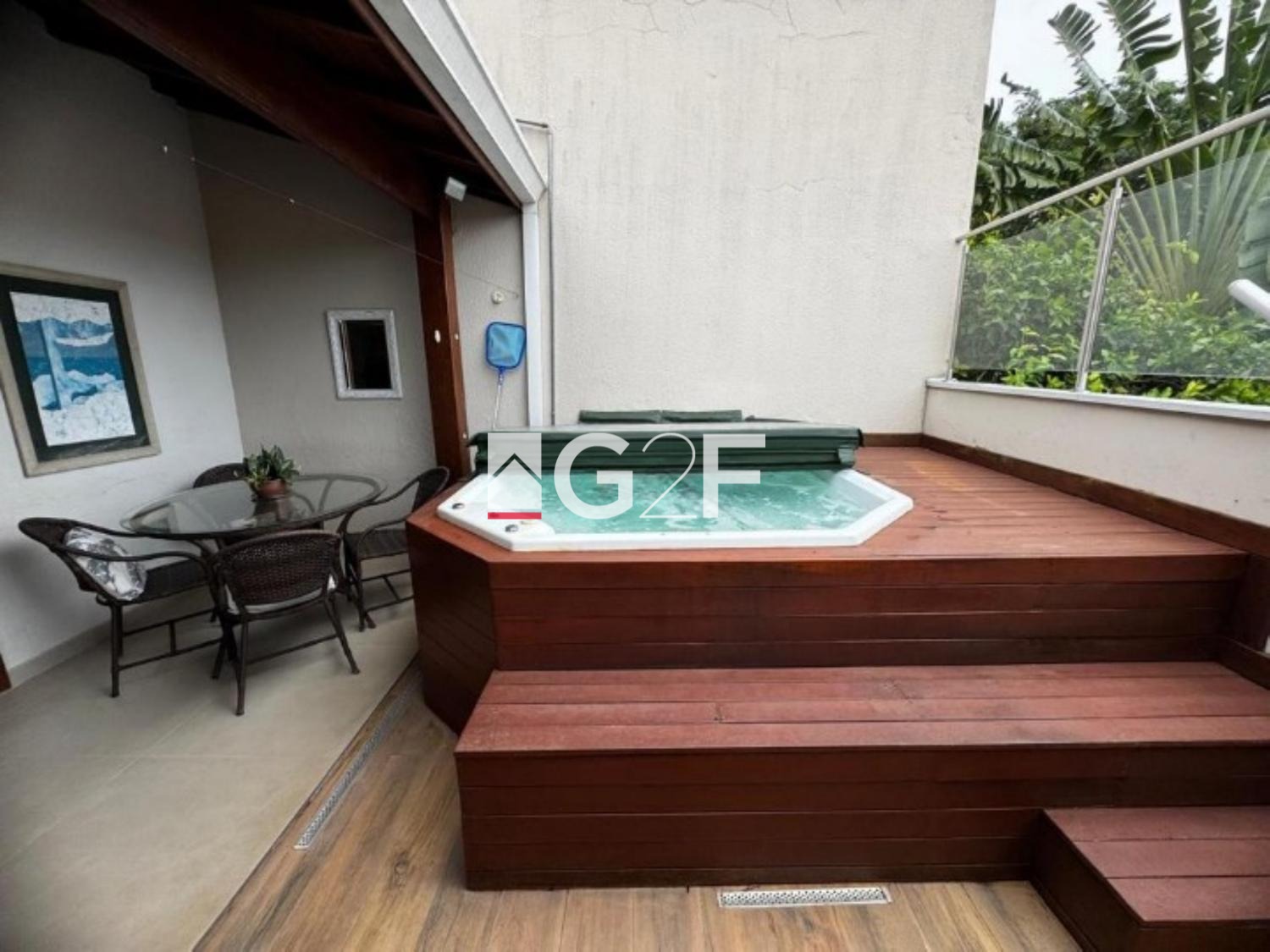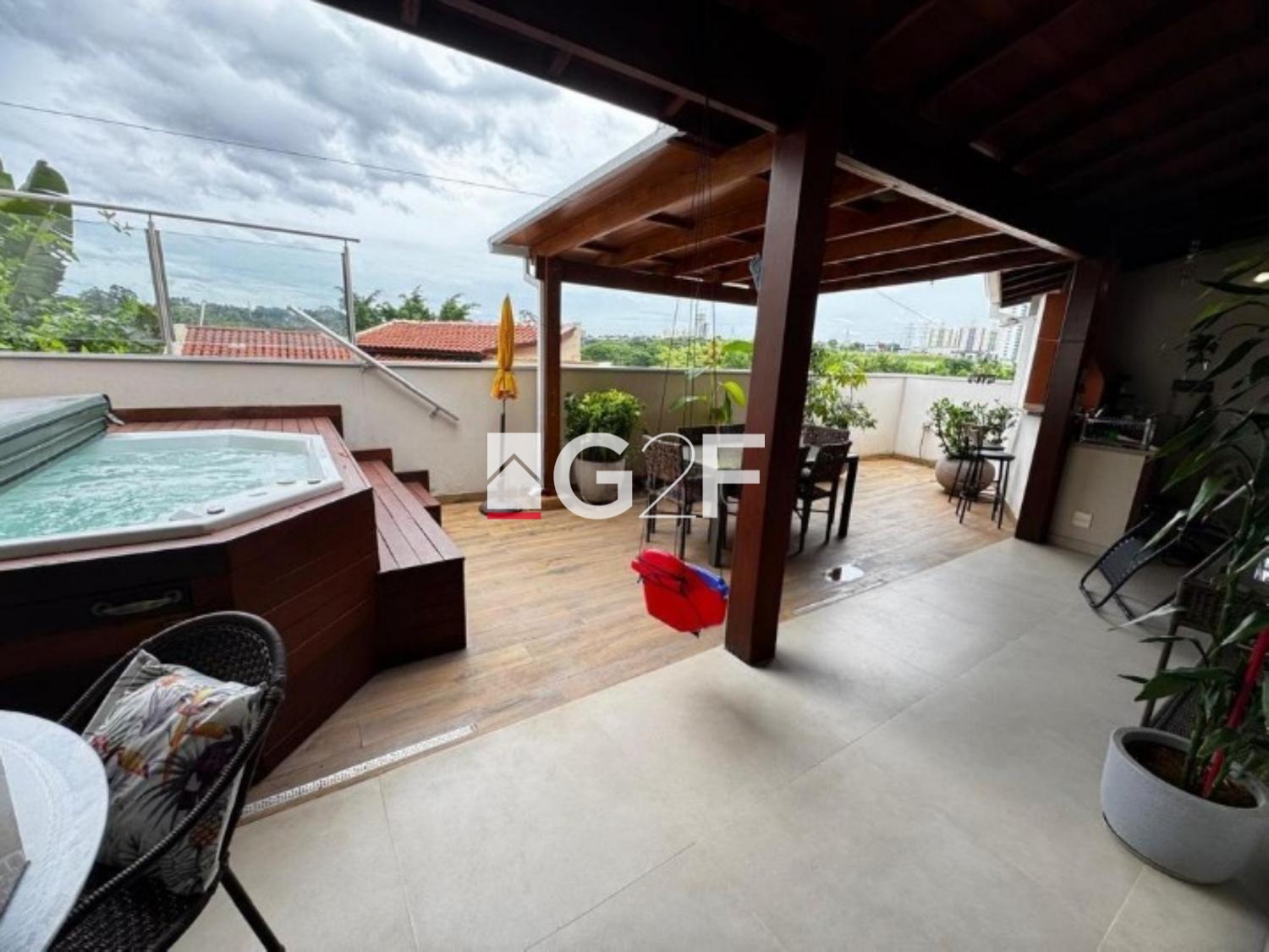 A propriedade também conta com uma garagem para 4 carros sendo 2 vagas cobertas, jacuzzi, lareira e uma varanda perfeita para relaxar. O espaço gourmet é ideal para receber amigos e familiares em um ambiente acolhedor.