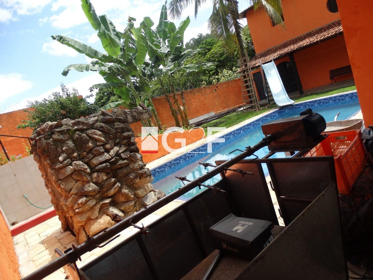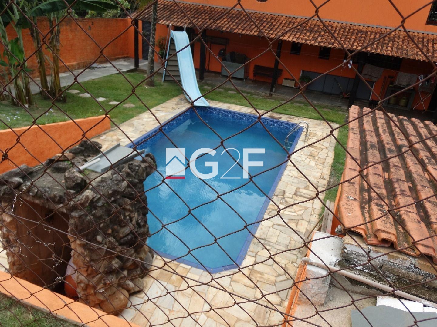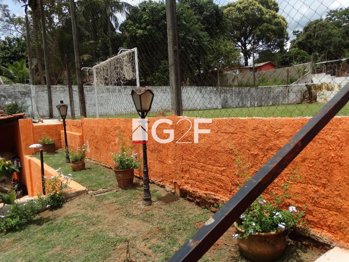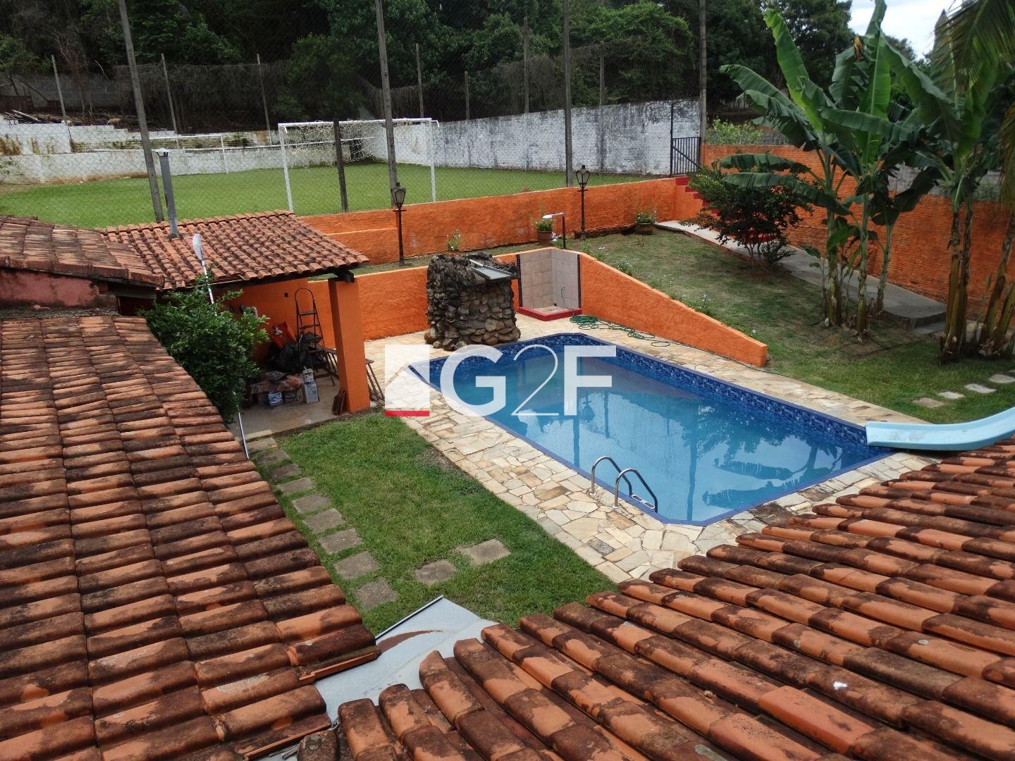 Área de lazer com churrasqueira, jardim com iluminação, forno e fogão a lenha, forno de pizza e churrasqueira giratória e som ambiente. Piscina com cascata, toboágua e ducha e mini campo de futebol com gramado e alambrado medindo 20x30 metros.