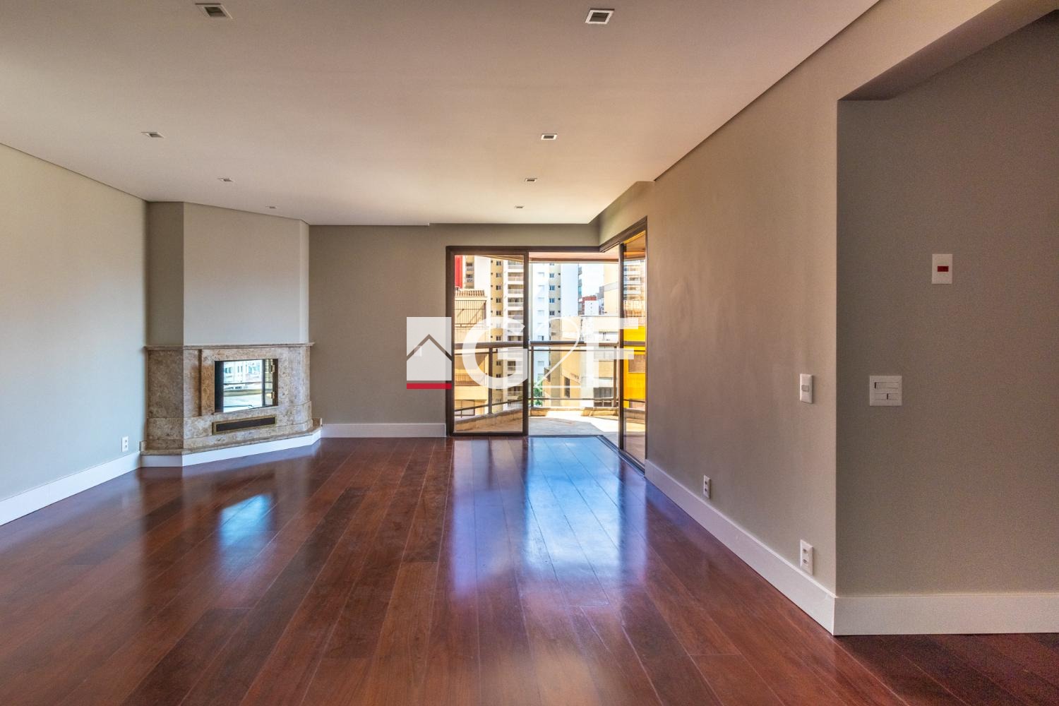 Sala de Estar com Lareira, Sala de TV e Sala de Jantar: Espaços integrados e iluminados, conectados a uma varanda que convida à contemplação.