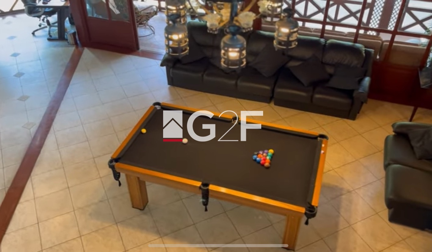 A casa principal inclui uma sala com capacidade para 100 convidados, sala de reunião, ampla sala de jantar, cozinha moderna, e área gourmet completa com fogão à lenha, churrasqueira e forno de pizza. Além disso, o projeto luminotécnico e o uso de luz natural proporcionam máximo conforto térmico e uma experiência visual inesquecível.