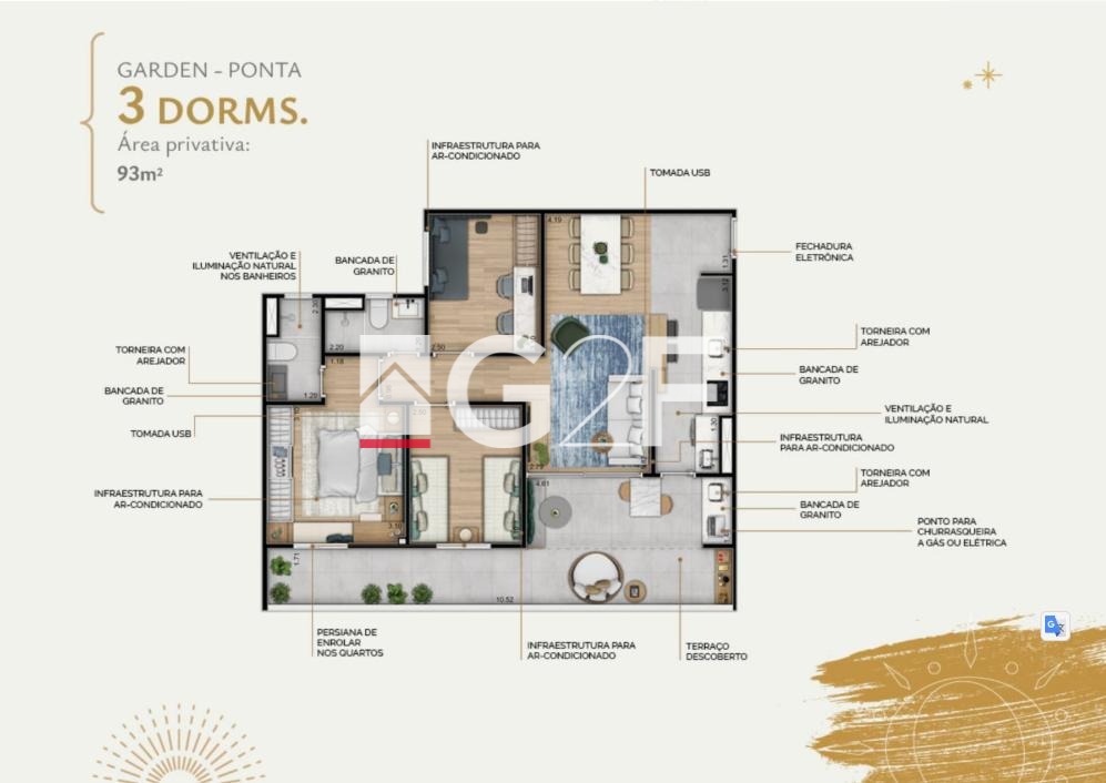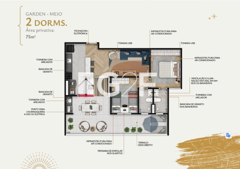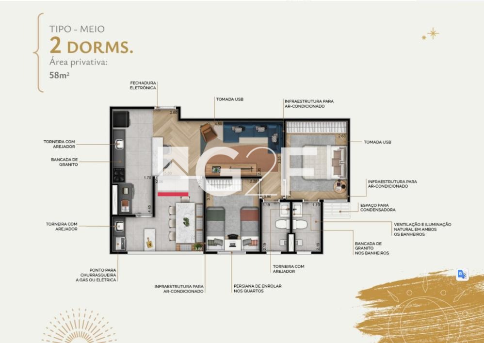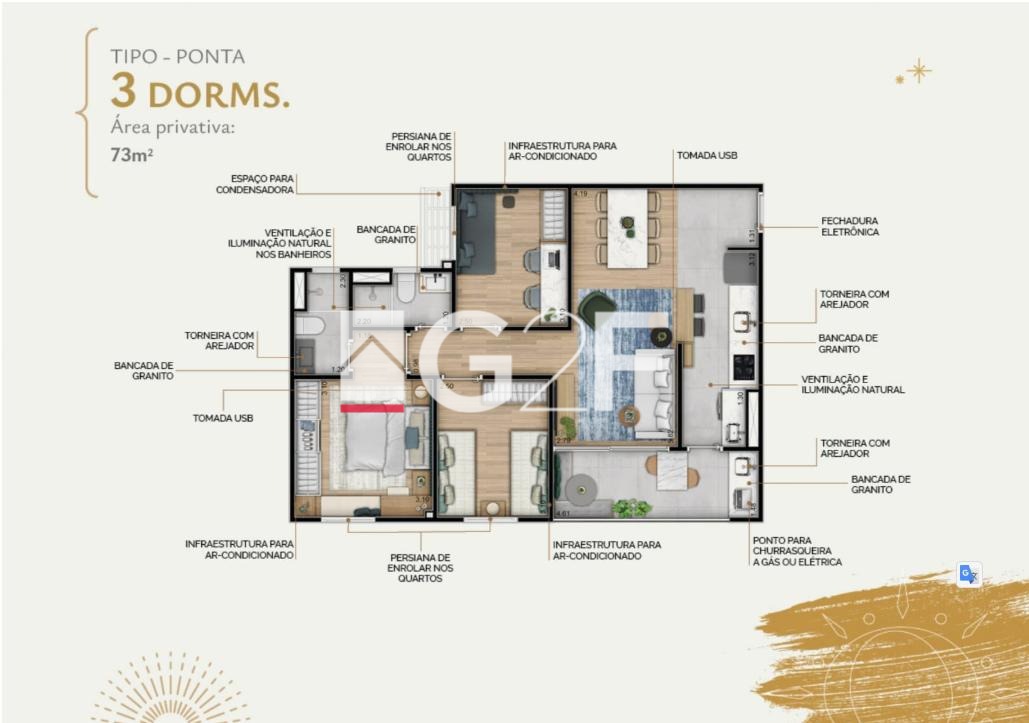 O empreendimento conta com apartamentos modernos de 2 ou 3 dormitórios, com plantas de aproximadamente 58 m² a 73 m², opções com suíte, varanda gourmet e 1 ou 2 vagas de garagem.