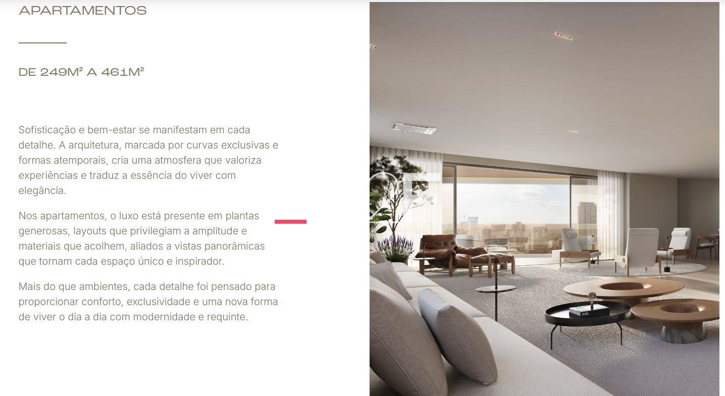 Os apartamentos possuem plantas amplas entre aproximadamente 248 m² e 348 m², além de opções exclusivas como garden com até 500 m², com 3 ou 4 suítes, 3 a 4 vagas de garagem e elevador privativo. O projeto prioriza integração de ambientes, iluminação natural e acabamento premium