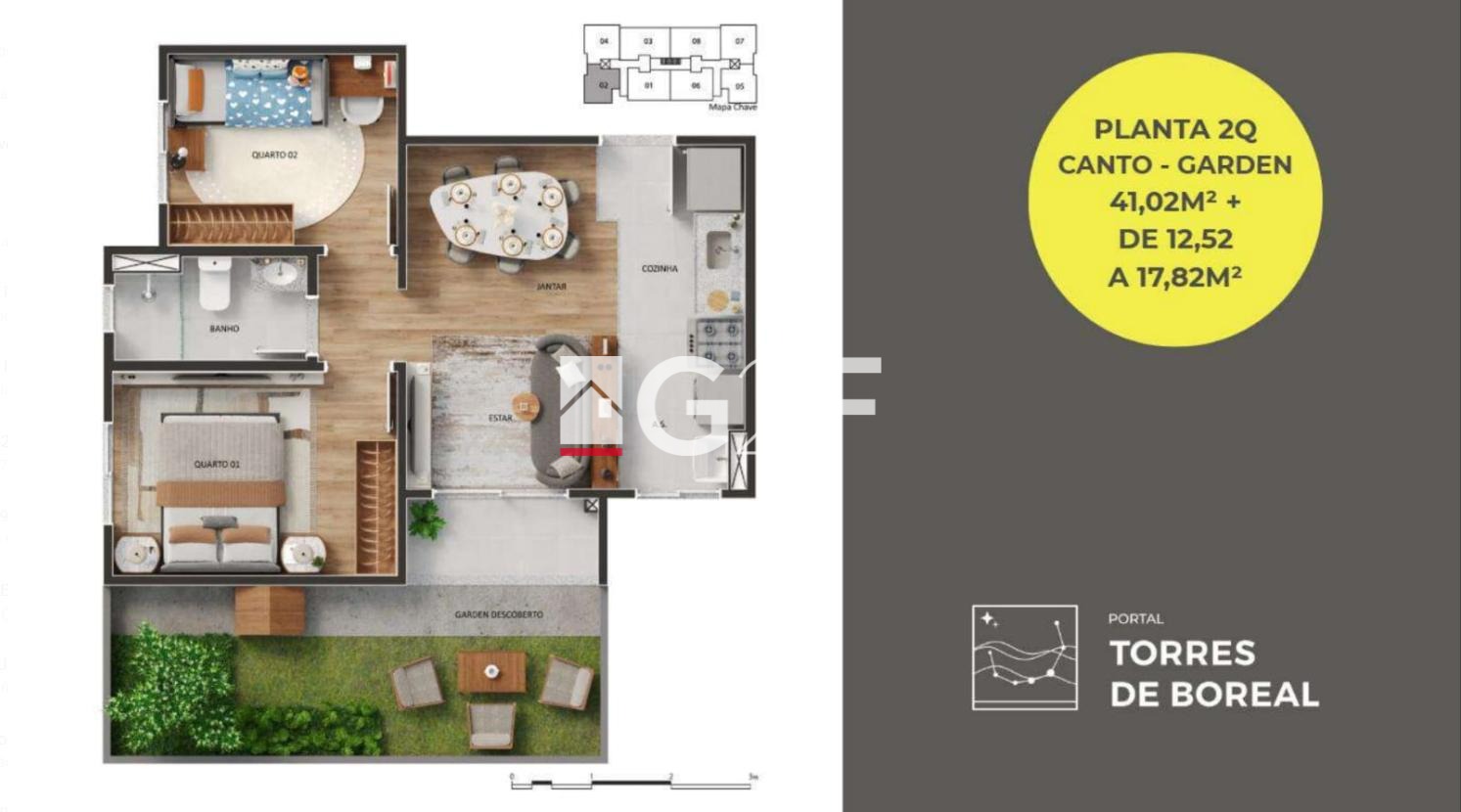 | Unidade | Dormitórios | Suítes | Banheiros | Vagas | Área Útil | Área Total | Terreno | Plantas |